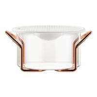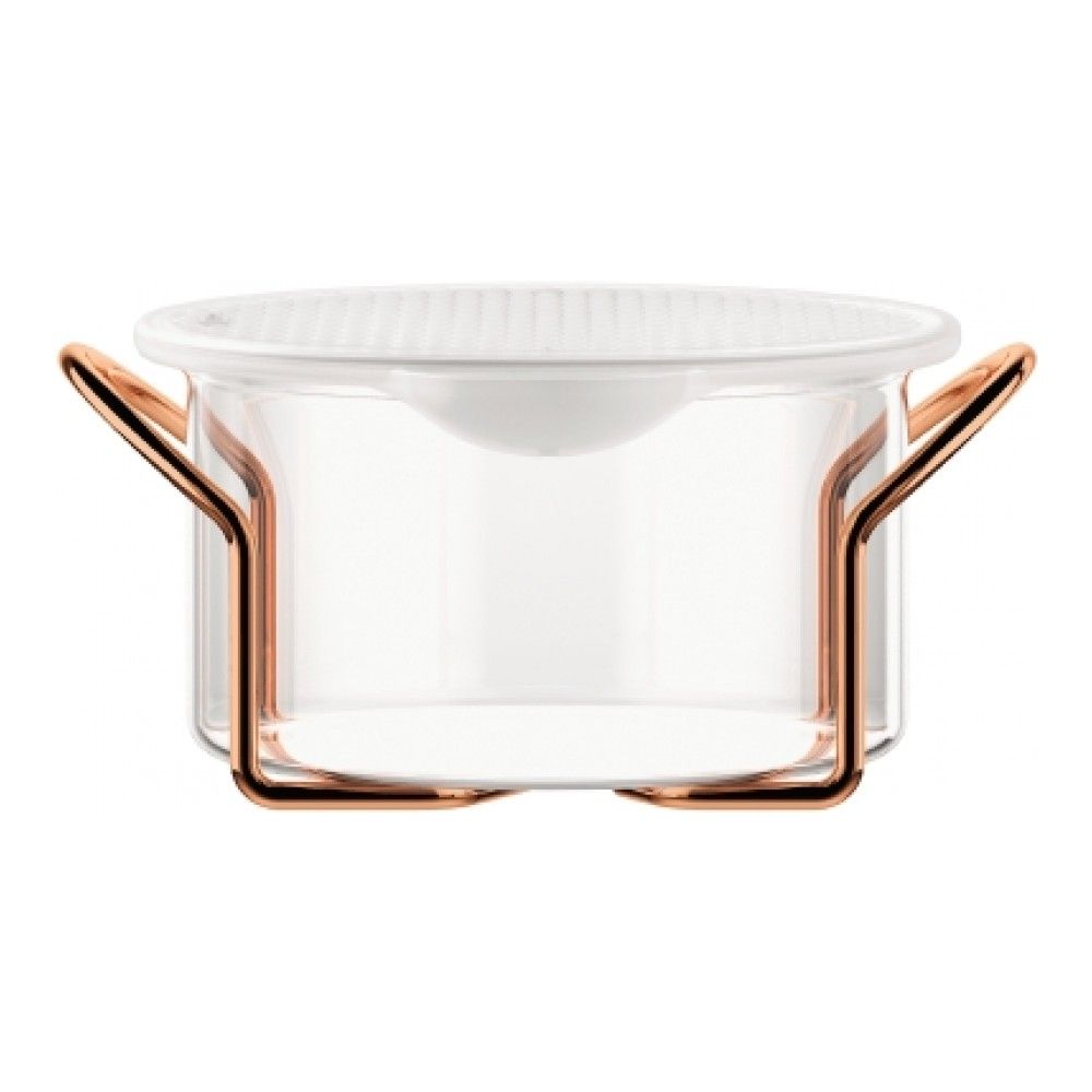 Эта стеклянная емкость е входит в редкую серию предметов BODUM в оправах медного цвета. Вся серия и эта емкость в частности, выдержана в стилистике легкого ретро. Медные серии встречаются у BODUM не часто, тиражи таких предметов невелики. Металлические оправы несут не только декоративную функцию, они предохраняют стеклянные колбы от случайных ударов. Сама же колба сделана не из обычного стекла, а боросиликатного. Оно выглядит более глянцевым, чем обычное, кроме того оно не тускнеет со временем. Боросиликатное стекло е мутнеет и не царапается, сколько бы вы его ни мыли.