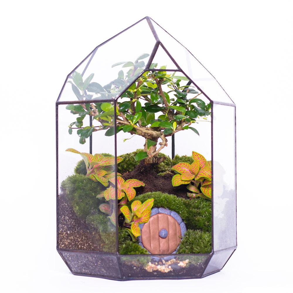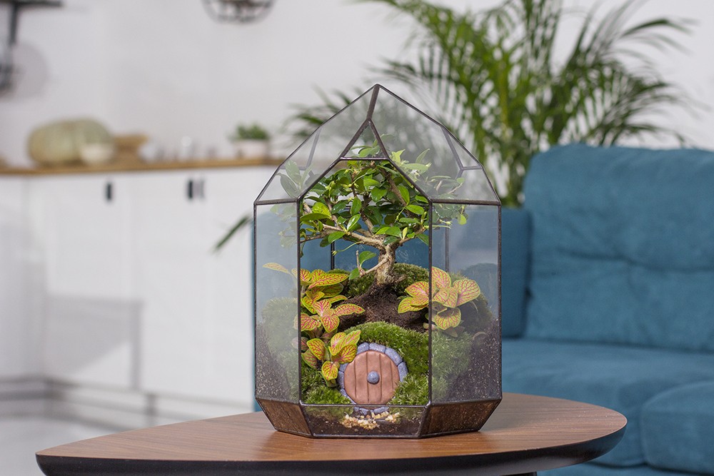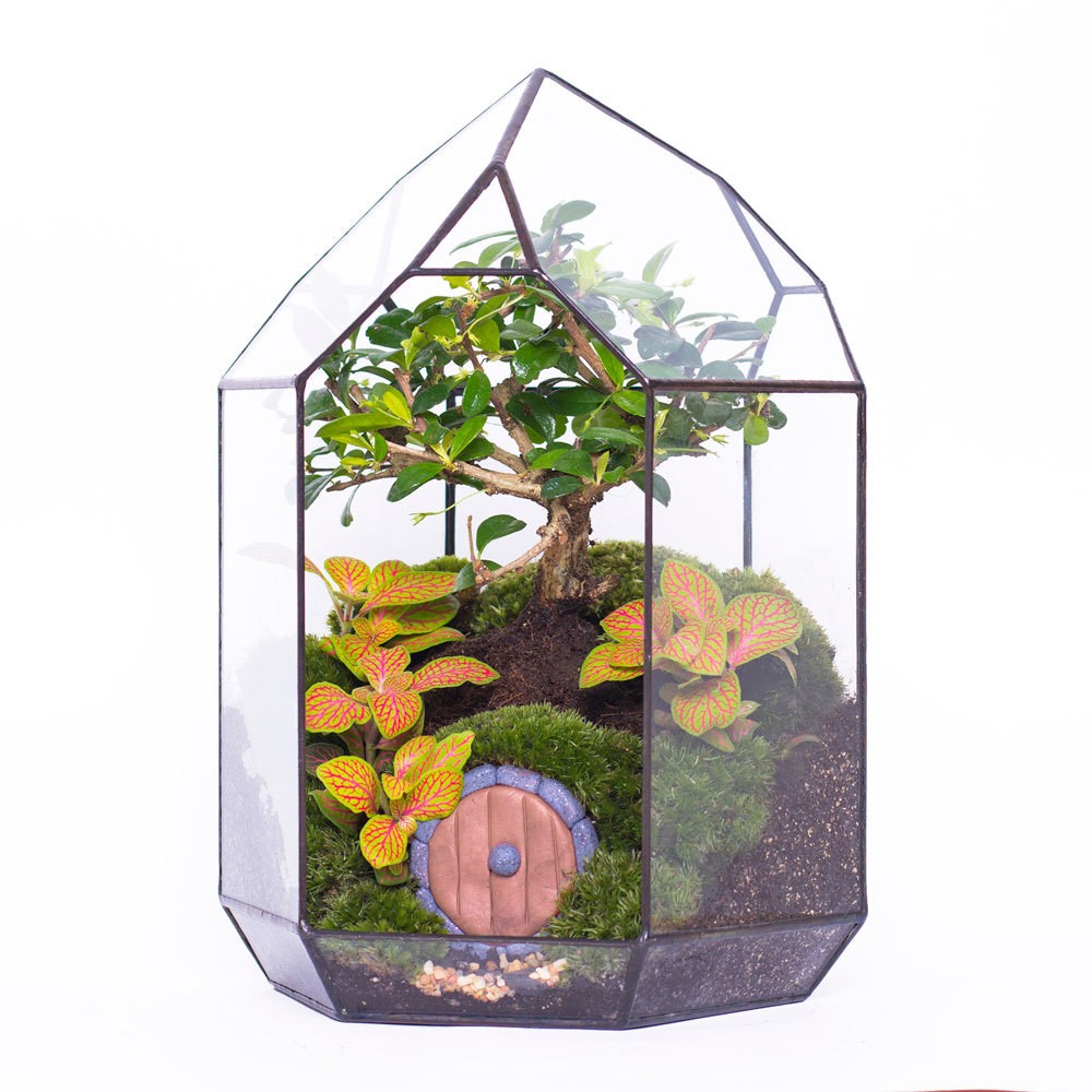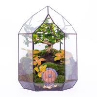 "Хоббитон" - изящная композиция с настоящим мини-деревцем бонсай, яркой фиттонией и натуральным мхом, которая иллюстрирует живописный пейзаж и ландшафт прекрасной страны хоббитов.