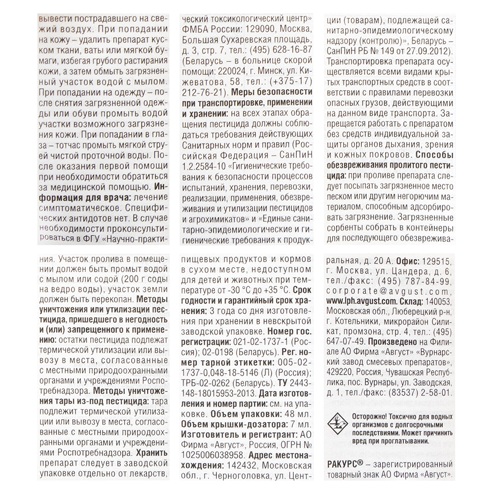 Системный фунгицид Ракурс Avgust (Август) - применяется для профилактики и лечения болезней, возникающих на хвойных растениях. Быстро проникает в ткани растения и не смывается дождем уже через 2 часа после опрыскивания. Обладает искореняющим действием, препятствуя появлению спор возбудителей. Благодаря сильным системным свойствам распределяется во всех вегетирующих частях растения (от основания до верхушки). Защищает растения в течение длительного периода (до 4 недель). Способ применения: Водный раствор вносят через направленное опрыскивание рано утром или поздно вечером. Норма применения препарата: 4 мл/5 л воды. Расход рабочей жидкости: 2 до 5 л/дерево (в зависимости от объема растения). Состав: 240 г/л эпоксиконазола +160 г/л ципроконазола. Объём: 48 мл.