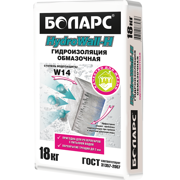 Гидроизоляция Боларс Hydrowall-H предназначена для устройства бесшовных водонепроницаемых покрытий на недеформирующихся горизонтальных и вертикальных основаниях. Легко наносится, высокоадгезионная. Обеспечивает конструкциям длительную водозащиту, предотвращает коррозию бетона. Благодаря сульфатостойкости, способна длительно противостоять влиянию агрессивных сред. Разрешена для применения в хозяйственном и питьевом водоснабжении. Рекомендуемые основания: бетонные, железо- и пенобетонные, силикатные, кирпичные основания, каменные и керамические кладки, цементно-песчаные штукатурки и стяжки. Не применять на гипсовых основаниях. Расход материал составляет 2,7 кг/м2 при толщине слоя 2 мм. Мешок 18 кг на 7 м2. Рекомендации по применению. Убедитесь, что основание прочное и чистое. Удалите с него ослабляющие сцепление вещества – жир, пыль и прочие загрязнения. Удалите отслаивающиеся и непрочные участки. Выровняйте основание штукатурными составами Боларс. Обработайте основание грунтовочными составами Боларс, соответствующими Вашему типу поверхности. Для подготовки смеси возьмите чистую водопроводную воду комнатной температуры (при нанесении кистью на 1 кг сухой смеси 0,20-0,22 л воды, на мешок 18 кг – 3,6-4,0 л; при нанесении шпателем на 1 кг сухой смеси 0,19-0,21 л воды, на мешок 18 кг – 3,4-3,8 л) и залейте её в чистую ёмкость. Засыпая сухую смесь в воду, перемешивайте раствор дрелью со специальной насадкой на низких оборотах до получения однородной массы. Подождите 5 минут, после этого перемешайте вторично. Готовый раствор находится в рабочем состоянии не менее 1 часа для нанесения кистью, и не менее 1,5 часов для нанесения шпателем. Первый слой наносится жесткой кистью или макловицей толщиной до 2 мм, тщательно обрабатывая поверхности. Через 3 часа кистью или шпателем нанести второй слой, придерживаясь правила перекрёстного нанесения. Второй слой наносят на ещё влажный, но уже схватившийся предыдущий слой. Перед нанесением второго слоя поверхность необходимо увлажнить. Работы рекомендуется производить в резиновых перчатках. При попадании раствора в глаза необходимо срочно промыть их большим количеством воды. Для защиты органов дыхания применять респираторы, для защиты органов зрения использовать защитные очки.