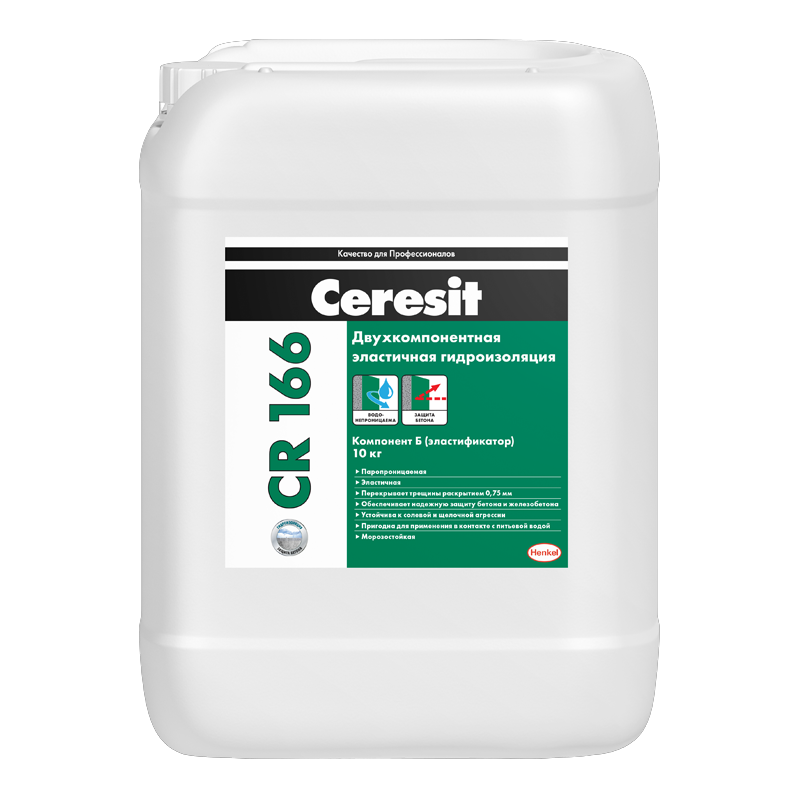 Ceresit CR 166 компонент Б представляет собой составную часть двухкомпонентной полимерцементной массы. Гидроизоляционная масса CR 166 предназначена для устройства эластичных водонепроницаемых покрытий на незасоленных минеральных, не содержащих гипс основаниях, в т.ч. подверженных деформациям, внутри и снаружи зданий. Может применяться: для гидроизоляции фундаментов, гидротехнических сооружений, террас, балконов, элементов зданий, находящихся ниже уровня земли и т.п.; для гидроизоляции ванн открытых и крытых бассейнов и резервуаров для воды хозяйственно-питьевого назначения глубиной до 50 м; для защиты бетонных и железобетонных сооружений от карбонизации (на пирсах, подпорных стенках, тоннелях, мостах, градирнях, опорах и т.д.). Обладает высокой химической стойкостью к щелочам, удобрениям (при pH > 4,5), гидравлическому маслу, 10%-ному раствору хлорида натрия, гипохлориту натрия, карбонату натрия (соде), сахару, 10%-ному раствору аммиака, ацетону. При наличии гидростатического напора гидроизоляция должна работать на прижим. Гидроизоляционное покрытие следует защитить от механических повреждений плиточной облицовкой или не содержащими гипс штукатуркой или стяжкой. Особенности Ceresit CR 166: паропроницаемая; эластичная; морозостойкая; перекрывает трещины раскрытием 0,75 мм; устойчива к солевой и щелочной агрессии; легко наносится кистью; пригодна для наружных и внутренних работ; экологически безопасна.