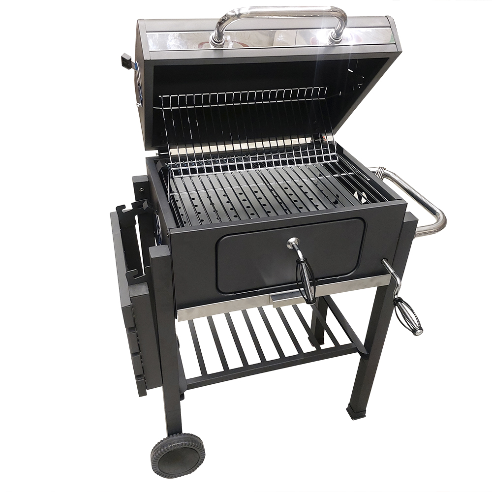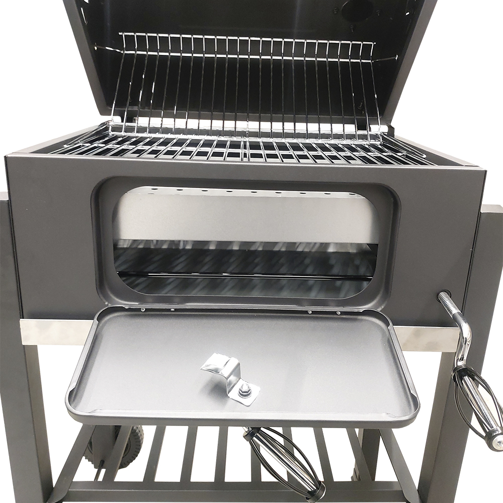Угольный гриль прямоугольной формы устанавливается на четыре стальные опоры сечением 4x4 см, две из которых оснащены колесами. Корпус выполнен из прочной стали и покрыт порошковой жаропрочной краской. Преимущества и особенности: - регулировка высота поддона осуществляется с помощью фронтальной вращательной ручки; - передняя дверца топки с ручкой предоставляет доступ к углям, позволяя не снимать продукты с решетки; - две регулируемые заслонки в крышке и две в жаровне обеспечивают необходимый поддув; - температурный датчик встроен в крышку устройства; - складной боковые столик с крючками для аксессуаров помогает организовать рабочее пространство; - нижняя полка для хранения; - съемный поддон-золосборник облегчает уход после использования; - труба с регулировочной крышкой обеспечивает устойчивую конвекцию. В комплекте 2 хромированных решетки, одна из которых предназначена для подогрева и поддержания блюд в горячем состоянии. Поставляется в разобранном виде. Инструкция по сборке прилагается. Технические характеристики: Размер решеток: 22,5x34 см, 2 шт. Размер топки: 53,8x38,5x23 см. Размер крышки: 53,8x38,5x17,5 см. Размер дверцы: 44x30x6 см. Высота трубы: 13 см. Диаметр трубы: 6 см. Высота приготовления: 79 см. Габариты упаковки: 46x63x43 см. Вес нетто: 20,3 кг