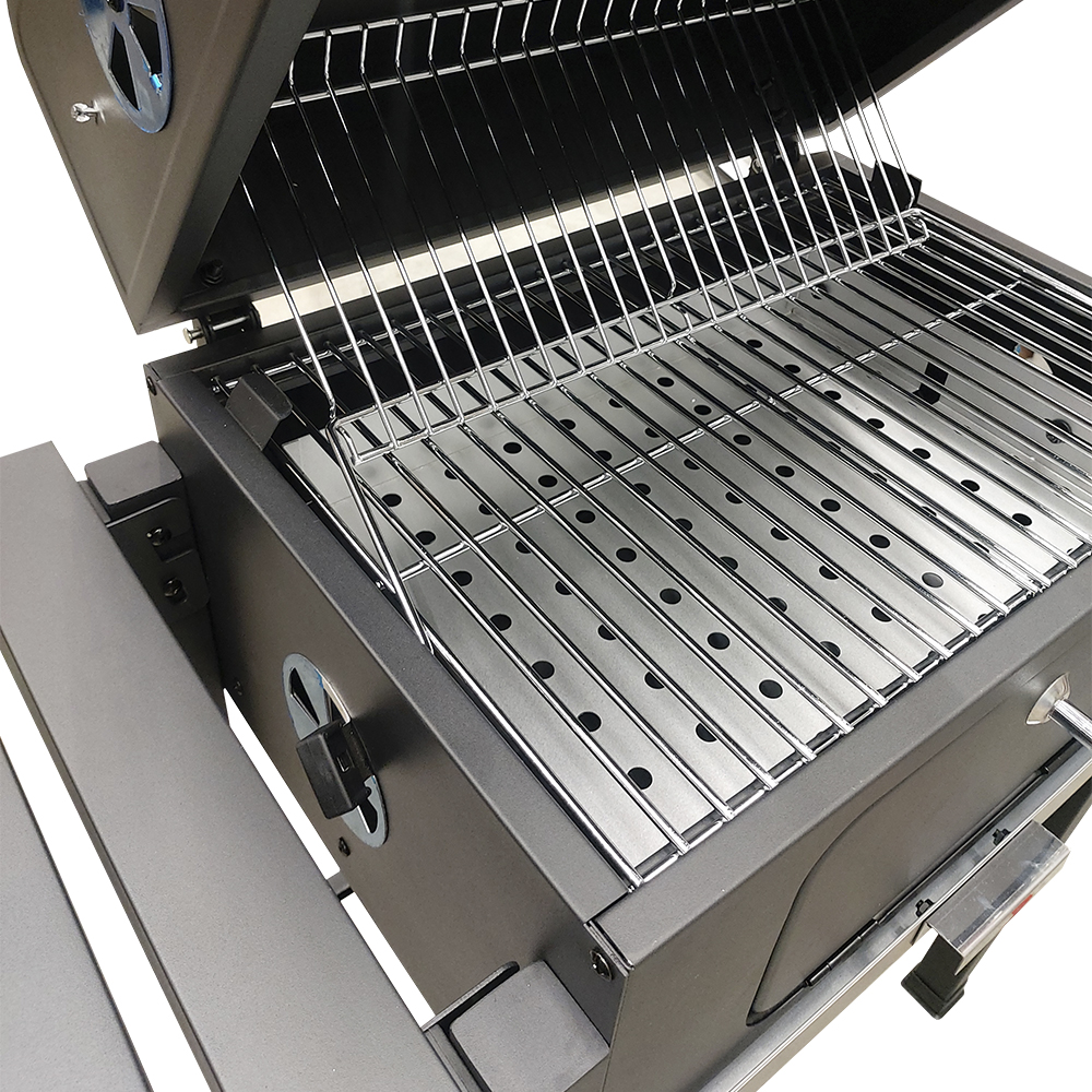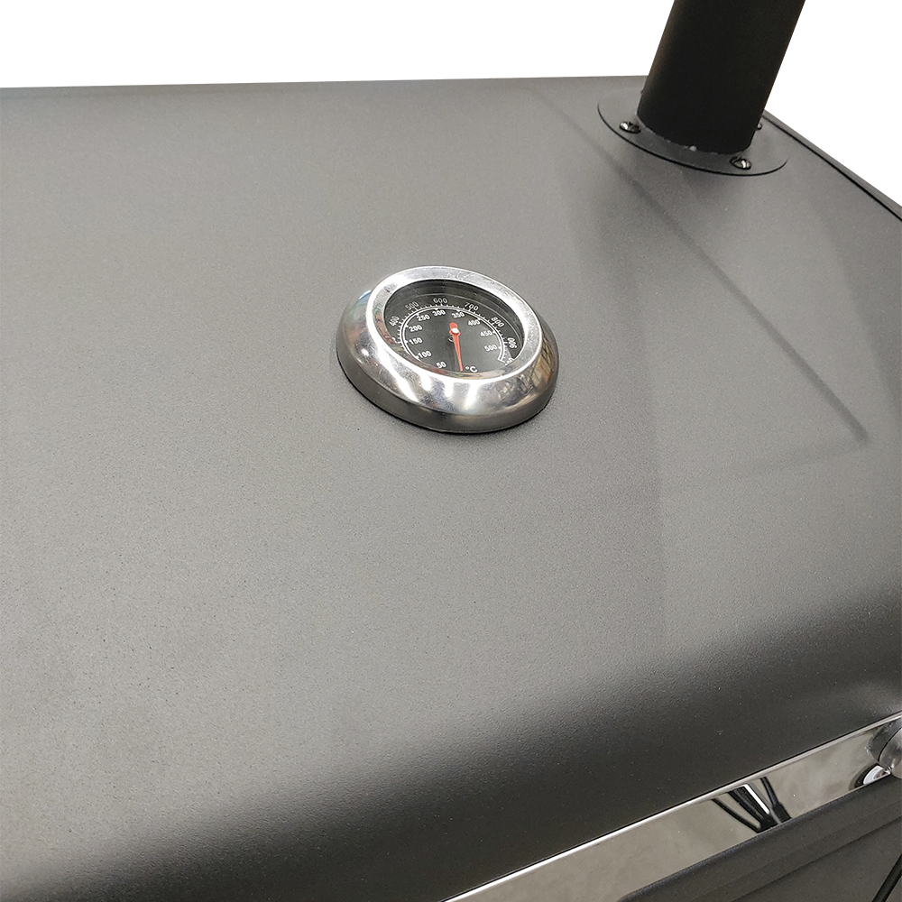 Барбекю-гриль с встроенным термометром, боковым столиком, фронтальной дверцей колосника и вращательной ручкой.