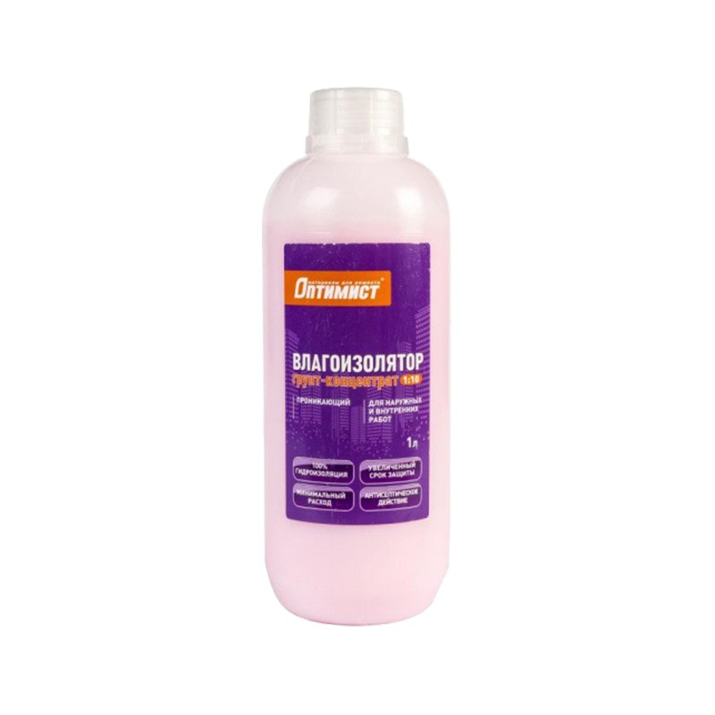 Концентрированный Грунт Оптимист G106 предназначен для влагоизоляции стен из бетона, кирпичной кладки, гипсокартонных панелей, цементной штукатурки, других минеральных, а также деревянных поверхностей. Грунт-концентрат рассчитан на использование в помещениях с повышенной влажностью: ванные комнаты, санузлы, подвалы, технические помещения. Расход: 100-150мл/м² при разбавлении водой 1:10, 200-250 мл/м² при использовании в неразбавленном виде. Время высыхания: 1 час.