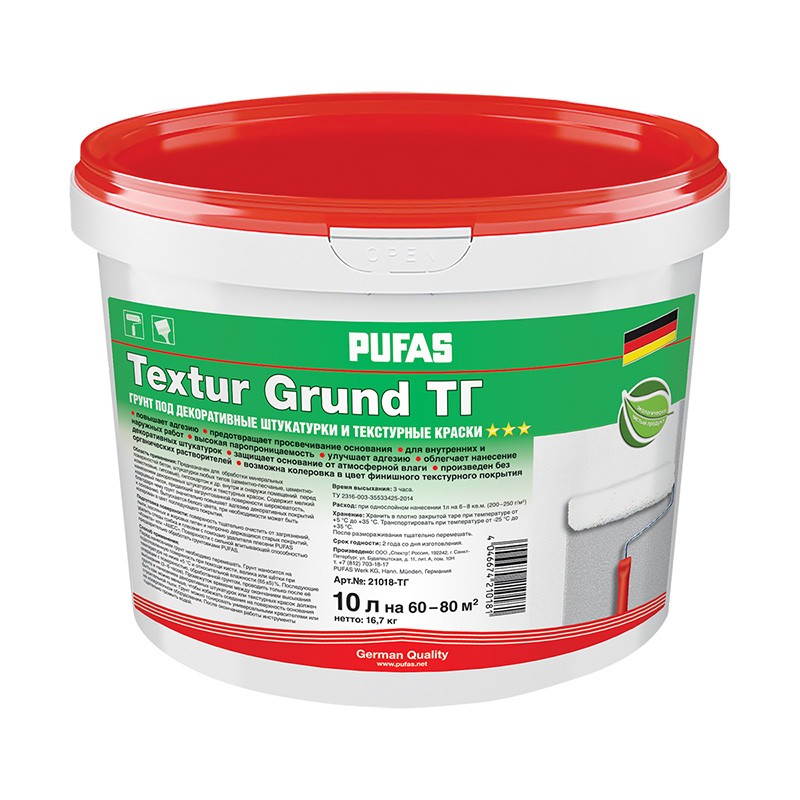 Грунт PUFAS Textur Grund предназначен для обработки минеральных поверхностей бетон, штукатурки любых типов (цементно-песчаные, цементно-известковые, гипсовые), гипсокартон и др. внутри и снаружи помещений перед нанесением декоративных штукатурок и текстурных красок. Содержит мелкий кварцевый песок, придающий загрунтованной поверхности шероховатость, благодаря чему грунт значительно повышает адгезию декоративных покрытий к основанию. Выпускается белого цвета, при необходимости может быть колерован в цвет последующего покрытия.