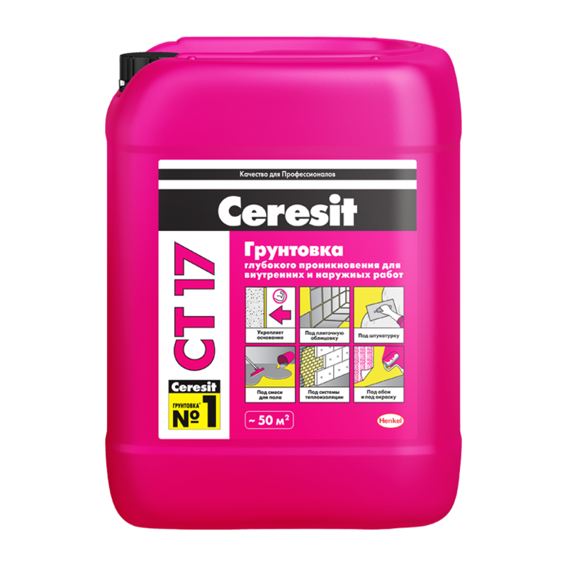 Грунтовка глубокого проникновения Ceresit CT 17 предназначена для обработки поверхностей перед нанесением штукатурных и напольных смесей,плиточных клеев и т.д. Применяется для обработки всех видов впитывающих оснований. Обладает высокой проникающей способностью, снижает впитывающую способность оснований, связывает пыль, укрепляет поверхность, предотвращает пересыхание тонкослойных выравнивающих смесей, повышает адгезию материалов к основанию. Расход: 0,1 – 0,2 л/м². Время высыхания: 4 - 6 часов.