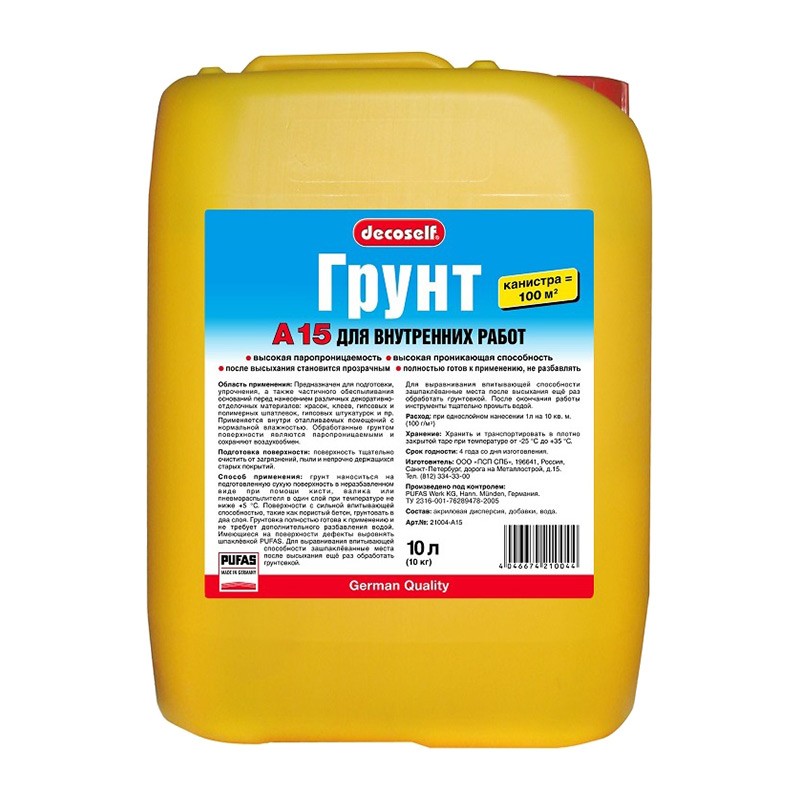 Грунтовка PUFAS Decoself A15 предназначена для подготовки, упрочнения, а также частичного обеспыливания оснований перед нанесением различных декоративно-отделочных материалов: красок, клеев, гипсовых и полимерных шпаклевок, гипсовых штукатурок. Применяется внутри отапливаемых помещений с нормальной влажностью. Расход: 1л/10 м² грунтовки.