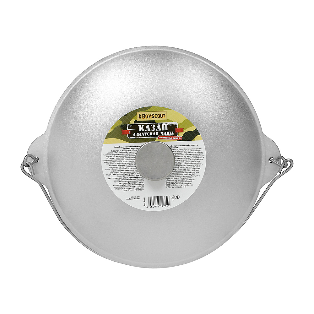 Казан BoyScout (Бойскаут) 61360 изготовлен из литого алюминия, что означает его легкость и долговечность. 'Азиатская чаша' имеет форму полусферы, поэтому пища не застревает в углах, её легко перемешивать, а также обеспечивает равномерный прогрев, подходит для приготовления множества блюд. Котелок снабжен съемной ручкой-дужкой из нержавеющей стали и алюминиевой крышкой. Казан можно использовать как на природе подвешивая за крючок на треноге, так и в домашних условиях на учаге. Технические характеристики: - диаметр: 32 см; - высота стенки: 14 см; - толщина стенки: 4 мм; - толщина дна: 5 мм; - ширина казана с учетом ручек: 38 см; - высота казана с учетом поднятой ручки-дужки: 35 см; - вес: 3 кг. Перед первым использованием в посуду налить воду и прокипятить. Вымыть казан без применения абразивных чистящих средств, сполоснуть и высушить. Если в процессе использования алюминиевой посуды на ней образовалось сильное загрязнение – допустимо использовать для очистки содовый раствор.