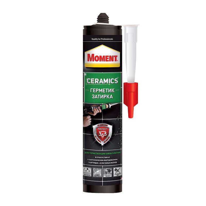 Герметик-затирка силиконовая «Moment Ceramics»– это готовая к применению однокомпонентная затирка с усиленным эффектом для герметизации угловых и примыкающих к санитарно-техническому оборудованию швов ( раковине, ванне и тд.). Основные преимущества Герметика-Затирки «Moment Ceramics»: водонепроницаема; дает усадки; предотвращает появление плесени; не вымывается из шва; не изменяет цвет с течение времени; подходит для помещений с повышенной влажностью; идеальна для всех видов плиток. Упаковка: картридж 280 мл. Расход: 1 картридж на 2кв м. Срок годности 12 месяцев.