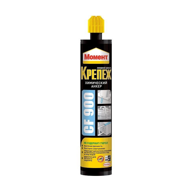 Химический анкер на основе винил-эфирной смолы «Момент Крепеж CF900» –представляет собой двухкомпонентный клеящий сосав, предназначенный для крепежа тяжелых конструкций на поверхностях из пустотелого кирпича, бетона и других строительных материалов.
