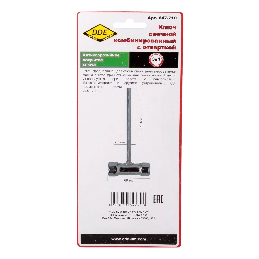 Комбинированный ключ DDE 647-710 - инструмент для обслуживания бензоинструментов. Предназначен для смены свечи зажигания, затяжки гаек и винтов при натяжении или смене пильной цепи. Покрытие - антикоррозийное. Размер: 15х0,68 см.