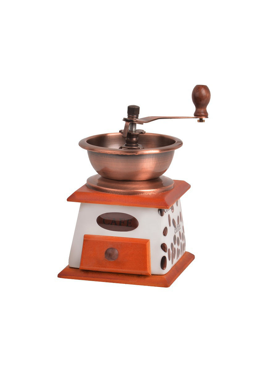 Максимальное количество кофейных зерен для помола 50 грамм. Кофемолка механическая жернового типа эстетичная и функциональная. Керамический корпус в комбинации с деревом. Металлическая чаша для помола. Деревянная емкость для молотого кофе. Помол кофейных зерен может быть выполнен в трех различных степенях: крупный, средний, мелкий.