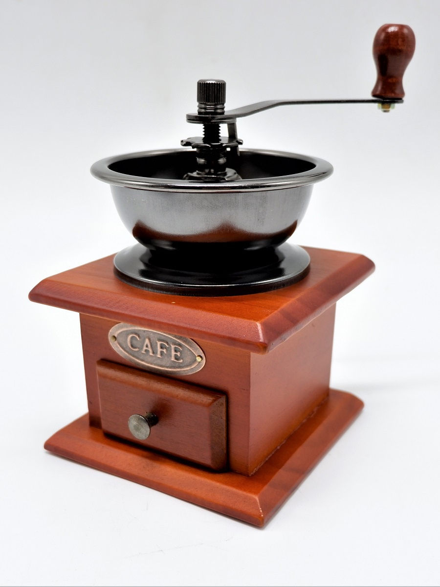 Кофемолка ручная. Состоит из металлической емкости для зерен кофе и корпуса из дерева с отсеком для молотого кофе. Жернов керамический. Регулировка степени помола.