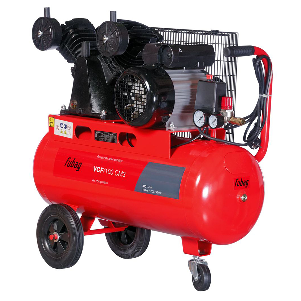 Масляный компрессор FUBAG (Фубаг) VCF/100 СM3 45681472– надежный, мощный ременной компрессор, который служит для подачи сжатого воздуха в пневмоинструмент. Компрессор оснащен вместительным ресивером на 100 литров. Аппарат подходит для интенсивной работы и является незаменимым оборудованием для работы на производстве, в мастерской или в строительстве. Особенности: -ременная система агрегата закрыта специальным решетчатым кожухом для защиты от механических повреждений; -увеличенная площадь охлаждающих ребер компрессорной головки обеспечивает более эффективный отвод тепла; -рукоятка со специальной резиновой накладкой гарантирует удобную транспортировку; -большие колеса служат для легкого перемещения агрегата по рабочей зоне, малое поворотное колесо - для маневренности. Преимущества: -класс защиты - IP23; -вместительный ресивер; -увеличенный масляный картер; -удобная транспортировка; -встроенный воздушный фильтр; -регулировка рабочего давления; -долгий срок службы.