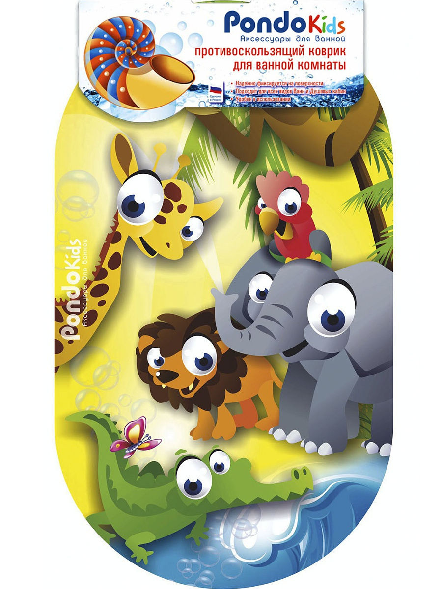 "Африка " - Детский коврик для купания и игр в ванне ТМ "Pondo ". Коврик произведен из 100% ПВХ, надежно фиксируется мягкими присосками и не скользит. Коврик ТМ "Pondo " способен украсить любую ванную комнату. На изделии изображены веселые и добрые животные Африки, вместе играем, изучаем, развиваемся. Оригинальный и красочный дизайн понравится малышам, поднимет им настроение, поможет в развитии и изучении окружающего нас мира. Чтобы коврик закрепился максимально надежно, рекомендуется его намочить водой и плотно прижать к чистой поверхности ванны.