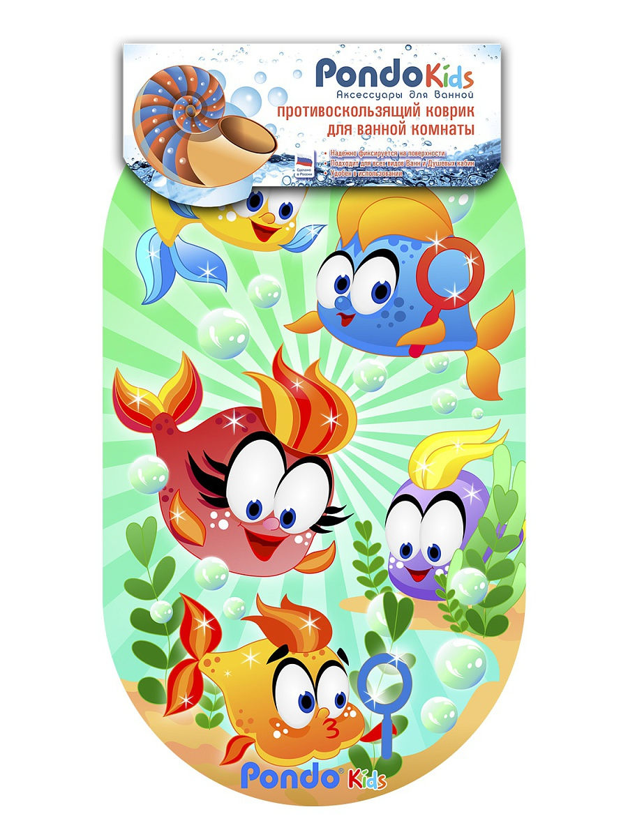 "Веселые Рыбки " - Детский коврик для купания и игр в ванне ТМ "Pondo ". Коврик произведен из 100% ПВХ, надежно фиксируется мягкими присосками и не скользит. Коврик ТМ "Pondo " способен украсить любую ванную комнату. На изделии изображены забавные, милые и дружные Веселые Рыбки, вместе играем, изучаем, развиваемся. Красочный дизайн понравится малышам, поднимет им настроение, поможет в развитии и изучении окружающего нас мира. Чтобы коврик закрепился максимально надежно, рекомендуется его намочить водой и плотно прижать к чистой поверхности ванны.