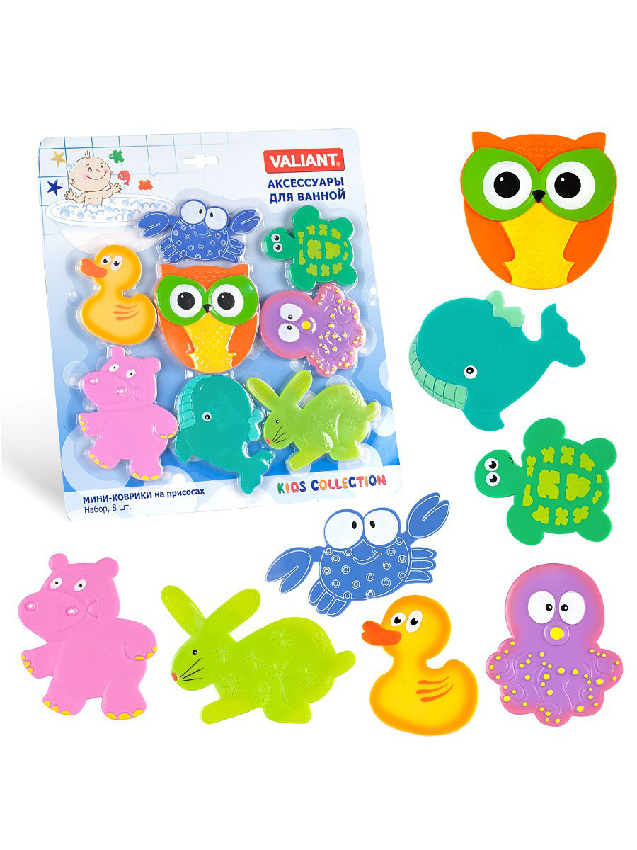 Набор мини-ковриков состоит из 8 фигурок и станет ярким цветовым пятном, на кафельной плитке или стенке душевой кабины. С яркими и забавными мини-ковриками купание ребенка станет увлекательным и поможет малышам развиваться и познавать мир, а ванная комната преобразится. На обратной стороне мини-ковриков расположены специальные эластичные присоски, благодаря которым коврики надежно крепятся к поверхности ванны и плитки. Качественные материалы и краски, используемые при изготовлении ковриков, гипоаллергенны и совершенно безопасны для детей, поскольку не содержат ФТАЛАТОВ. Размеры ковриков: сова 12x11.5 см, бегемот 13x10 см, утка 9x10 см, краб 14x7 см, черепаха 13x10 см, осьминог 12x10 см, заяц 14x10 см, кит 11.5x10 см.