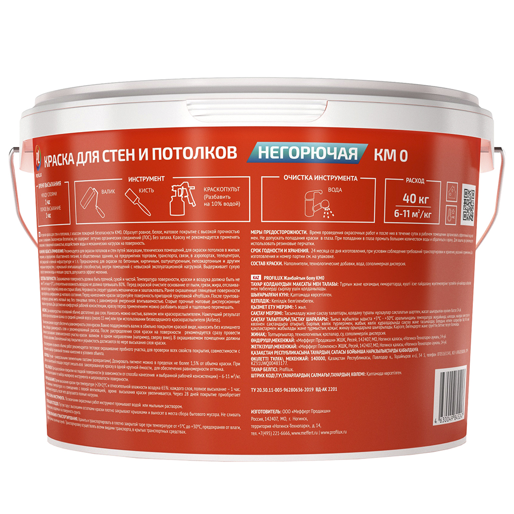 Интерьерная краска ProfiLux для потолков и стен путей эвакуации, технических помещений, в жилых помещениях, на предприятиях общественного питания, общественных зданиях, на предприятиях торговли, транспорта, связи, аэропортах, телецентрах, любой гражданской и военной инфраструктуры и т.п. Основания: бетон, кирпич, оштукатуренные, гипсокартонные и другие минеральные поверхности с нормальной впитывающей способностью внутри помещений с невысокой эксплуатационной нагрузкой. Свойства: Без запаха. Негорючая, с классом пожарной безопасности КМ-0. Образует ровное, матовое покрытие. Высокая прочность сцепления с основанием. Высокая паропроницаемость. Не содержит летучих органических соединений. Выдерживает сухую уборку без применения воды и моющих средств, допускается эффект меления. Не рекомендуется применять в помещениях с повышенной влажностью. Инструмент для нанесения: кисть, валик или методом распыления. Время высыхания каждого слоя -1 час. Покрытие приобретает окончательную твердость через 28 дней, после чего допускаются полные нагрузки, включая сухую уборку.
