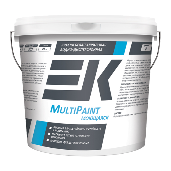 Моющаяся водно-дисперсионная краска ЕК MultiPaint для стен и потолков предназначена для окрашивания стен и потолков внутри сухих жилых, подсобных и административных помещений, требующих регулярной влажной уборки (кухня, прихожая, детская комната и др.). Может наноситься на бетонные, кирпичные, оштукатуренные и другие минеральные, а также деревянные, гипсокартонные, древесностружечные и древесноволокнистые основания внутри помещений.