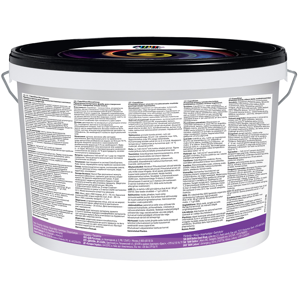 Износостойкая интерьерная краска CAPAROL (Капарол) CapaSilan для покраски стен и потолков в: - квартирах; - больницах; - домах престарелых; - гостиницах; - кафе и ресторанах; - офисах, школах и детских садах; - жилищном строительстве. Основания: минеральные штукатурки, гипсовые штукатурки, гипсоволокнистая плита, бетон, силикатный кирпич, неокрашенные древесно-стружечные, рельефные или тисненые бумажные обои. Преимущества и свойства: Рекомендована в качестве ремонтного покрытия на акустических системах и штукатурках. Без растворителей, активных мелящихся и матирующих субстанций. Длительное время высыхания способствует нанесению без видимых следов стыковки. Высокая паропроницаемость. Оптимальная раскатка. Легка в нанесении. Состав: эмульсия силиконовых смол и специальная дисперсия искусственных смол. Разбавитель: вода до 10%. Инструмент: кисть, валик или оборудование безвоздушного напыления. Время высыхания: через 4–6 часов высыхает на поверхности и готова к последующей обработке. Способна нести нагрузки через 14 дней. Окончательная твердость через 28 дней.