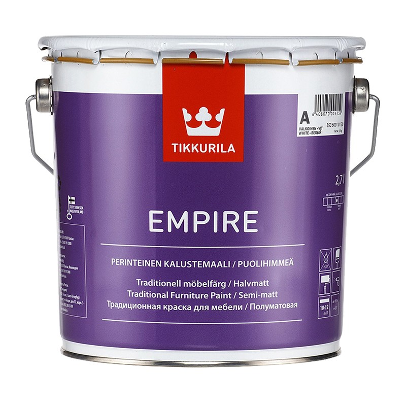 Тиксотропная алкидная краска. Применяется для окраски металлических и деревянных поверхностей, древесностружечных и древесноволокнистых плит внутри помещений. Empire хорошо выравнивается по поверхности и легко наносится кистью. Применяется для окраски мебели, дверей, радиаторов, оконных переплетов внутри здания, садовой мебели и т.д. Расход: 10-12 м²/л. Время высыхания: "от пыли" – 3 часа. Следующий слой можно наносить через сутки.