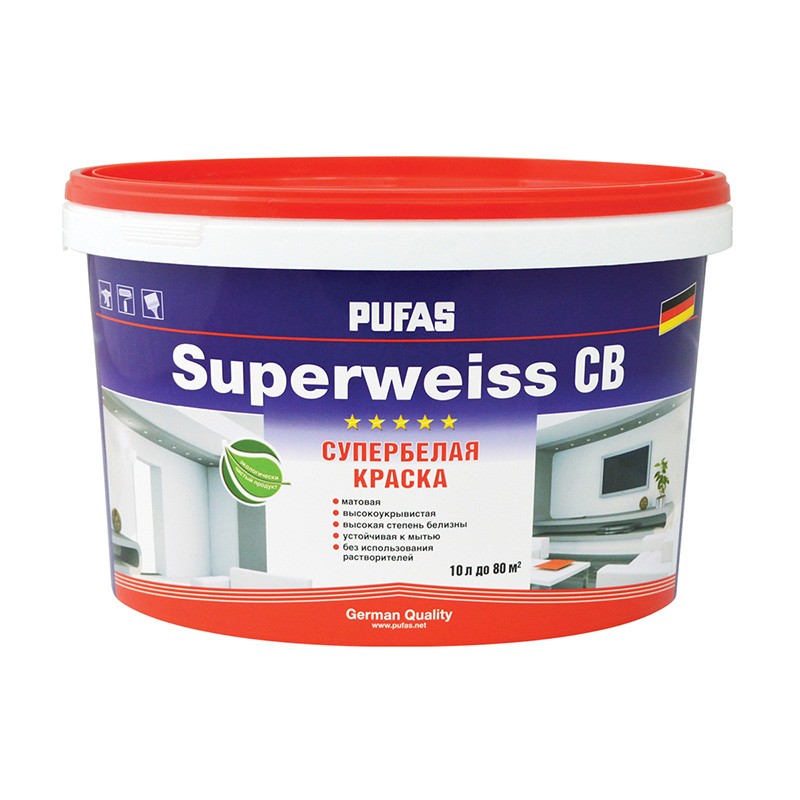 Краска PUFAS Superweiss в/д, моющаяся, супербелая 10 л