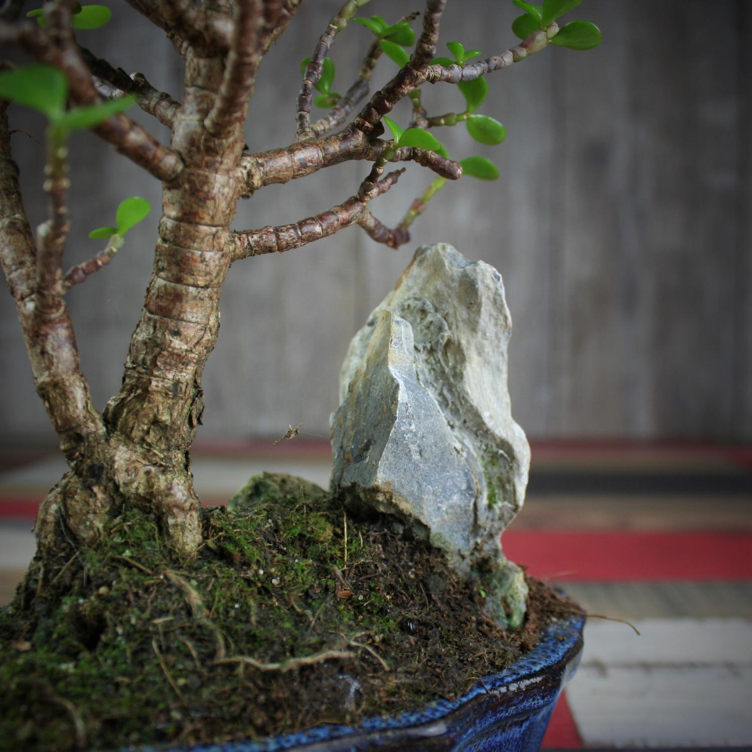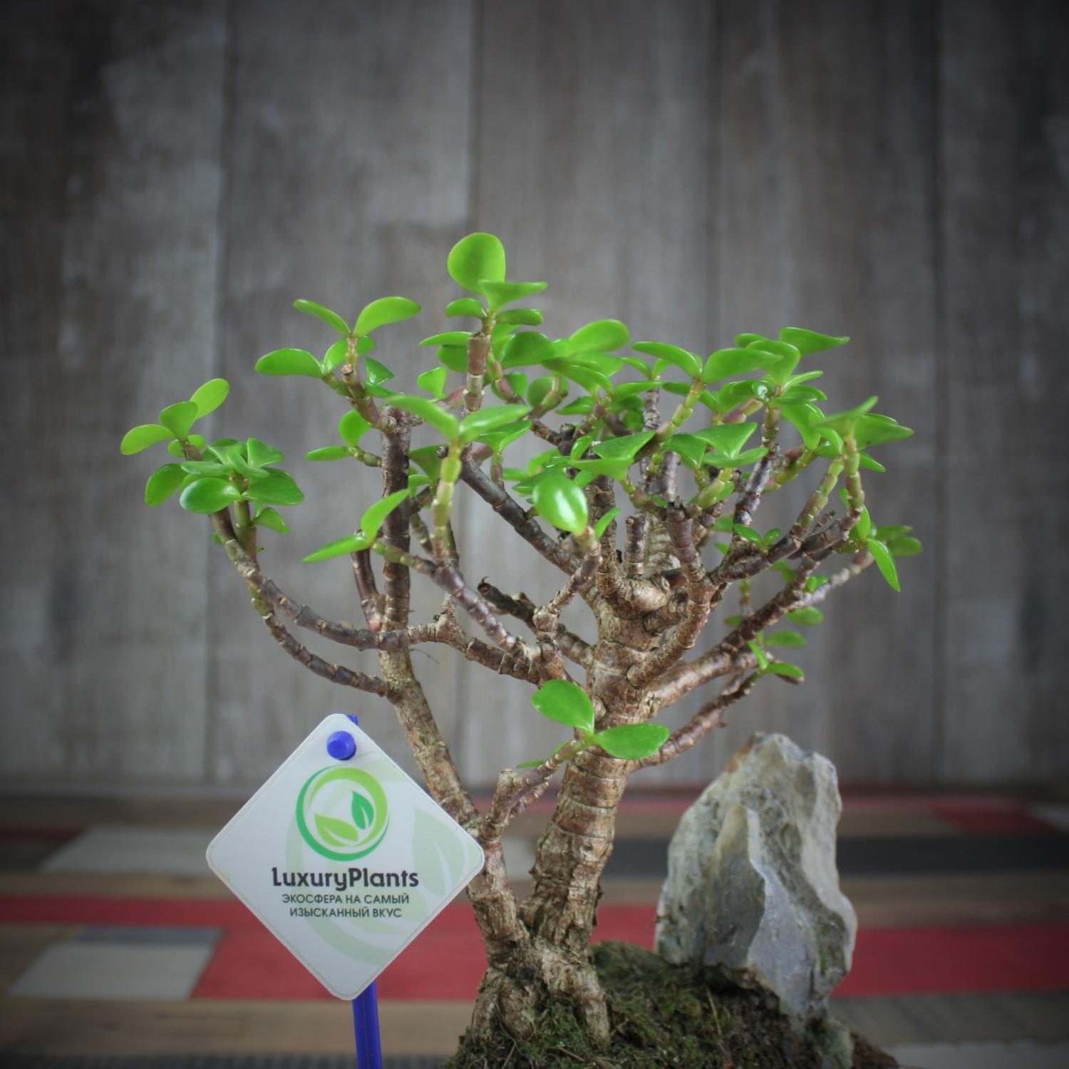 Прекрасный бонсай Крассула со скалой. Название на латыни - Crаssula. Материал плошки - керамика.