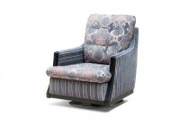 Кресло с наклонной подушкой спинки, с узкими локотниками, деревянный декор по периметру локотников и царги, имеет поворотный механизм |
