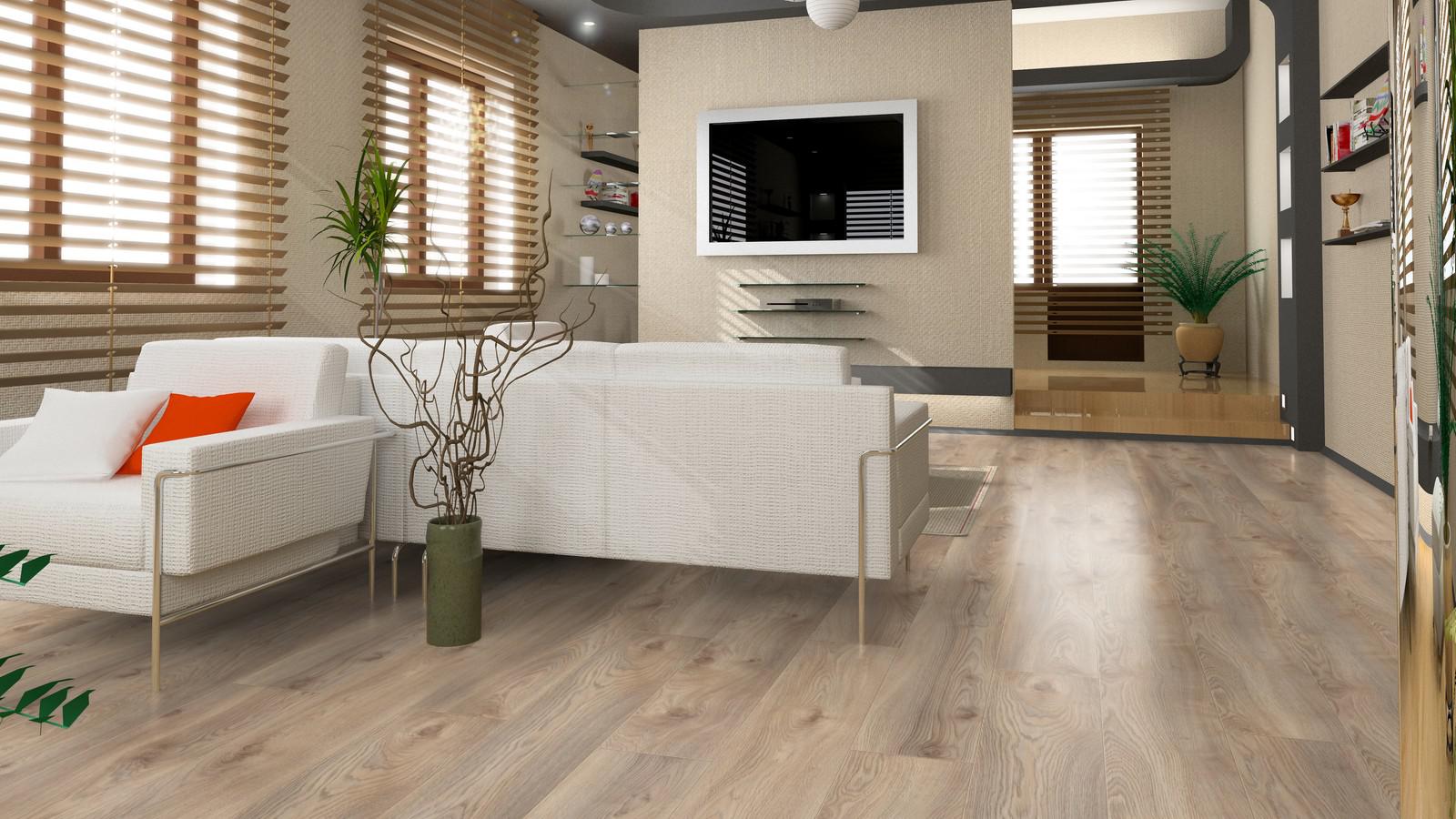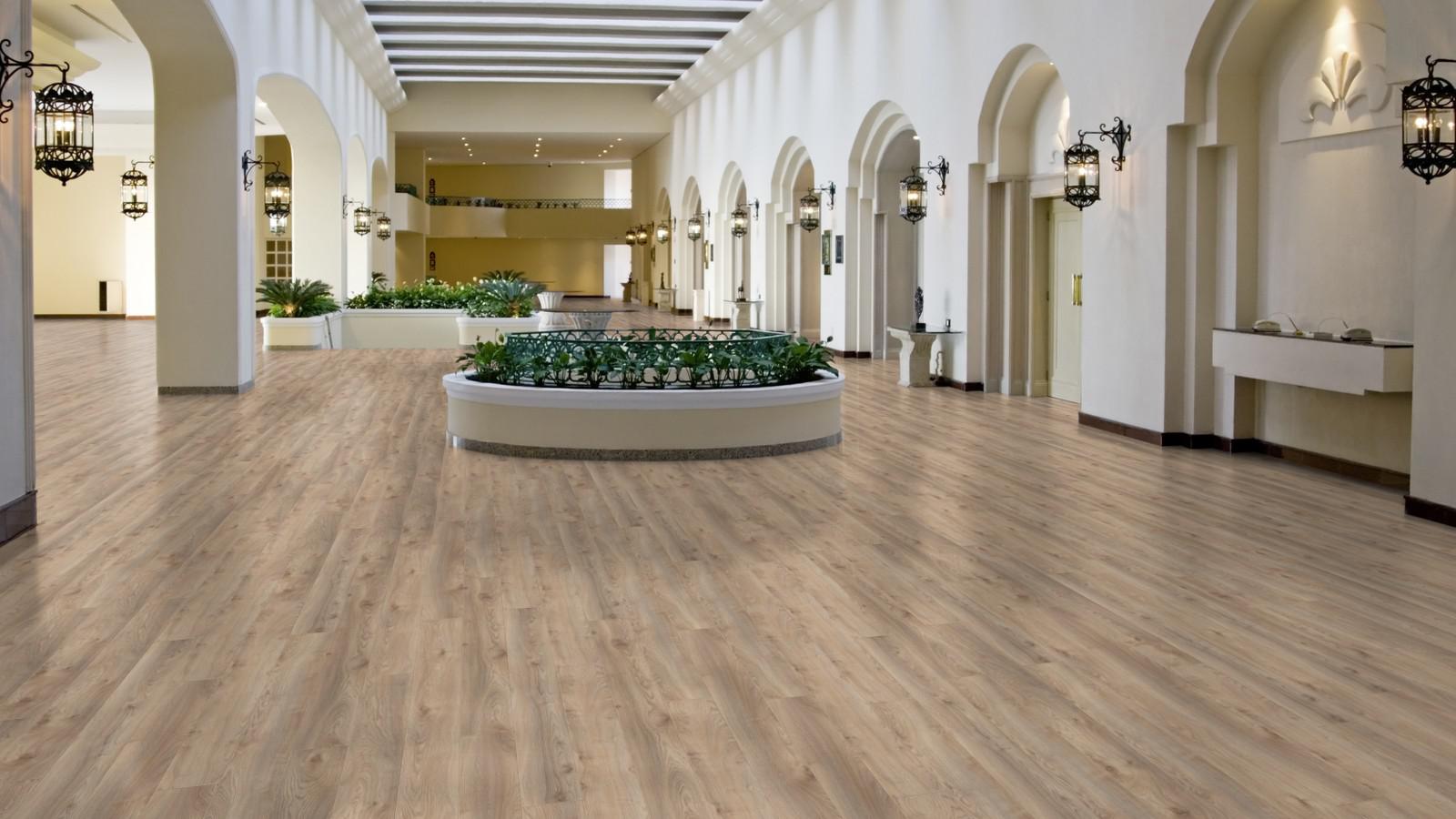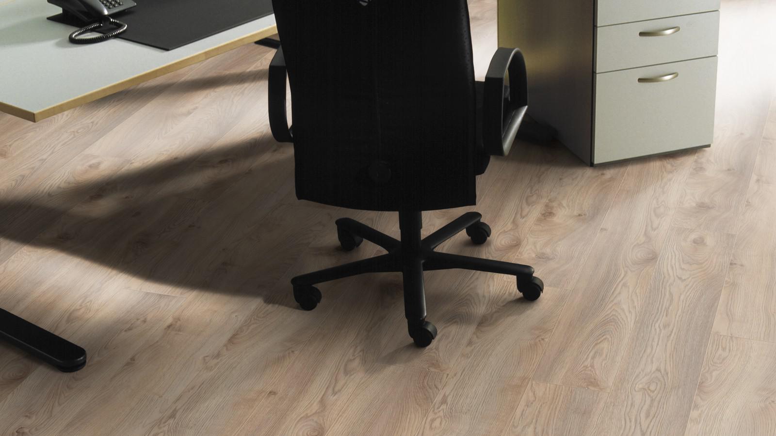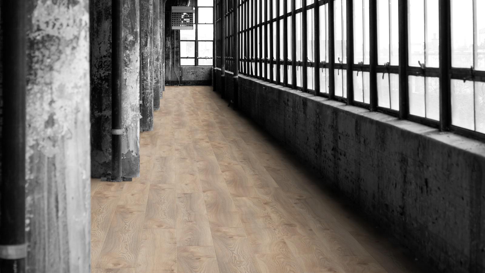 Ламинат Kronotex Mammut D3669 Дуб Макро бежевый 33 класс, 12 мм позволяет создавать элегантные концепции дизайна больших помещений, а V-образная фаска завершает картину презентабельного пола, отчетливо напоминающего дощатый.