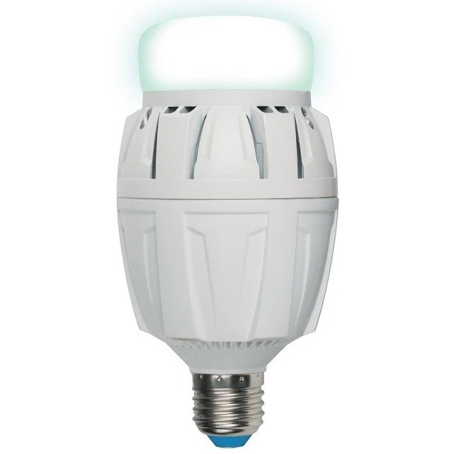 Светодиодная лампа Uniel Venturo LED-M88-50W/DW/E27/FR ALV01WH – это энергосберегающая светодиодная лампа высокой мощности, которая является прямой заменой ламп накаливания и компактных люминесцентных ламп высокой мощности, а также альтернативной заменой ртутных и натриевых ламп высокого давления. Лампы данной серии рекомендуются для общего освещения помещений производственного или иного назначения с высокими пролётами, ангаров, складов и пр. Лампы серии Venturo потребляют до 10 раз меньше электроэнергии, чем лампы других типов. Кроме того, в эксплуатации они значительно выгоднее, поскольку имеют продолжительный срок службы до 30 000 часов. Для работы ламп Venturo помещению требуется меньшая подведенная мощность, что тоже дает возможность значительно сэкономить. Корпус лампы выполнен из алюминиевого сплава с высокой теплопроводностью. Матовый рассеиватель даёт ровный свет. Широкий угол рассеивания света в 180° обеспечивается специальной конструкцией лампы. Лампа имеет совершенную систему охлаждения: радиатор активного охлаждения и дополнительные вентиляционные каналы в верхней и нижней частях корпуса обеспечивают эффективный отвод тепла от внутренних частей лампы и светодиодного модуля, гарантируя заявленный срок службы изделия. Преимущества светодиодных ламп Uniel Venturo: Корпус лампы выполнен из алюминиевого сплава. Радиатор активного охлаждения и дополнительные вентиляционные каналы обеспечивают эффективный отвод тепла. Матовый рассеиватель даёт ровный свет. Широкий угол рассеивания света в 180°. Компактный размер. Высокие показатели светового потока. Высокий индекс цветопередачи (≥ 80 Ra). Диапазон рабочего напряжения 100–265 В. Экологическая безопасность – не содержат тяжёлых металлов и ртути. Экономия электроэнергии 90%. Долгий срок службы – до 30 000 часов.