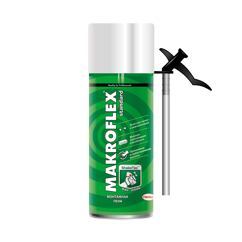 Пена монтажная Makroflex "ShakeTec" - это состав, который используется для заполнения полостей в стыках при монтаже окон, дверных коробок и других конструкций. Также ее применяют для заделывания щелей и трещин при теплоизоляции помещений. Данный материал представляет собой герметик на основе пенополиуретана. В составе такой пены – синтез изоцианата и полиола. Пенообразователем служит газ, заключенный вместе с пеной в баллон, он же создает давление, необходимое для выхода пены. Чаще всего применяют смесь сжиженных газов: пропана, бутана и изобутана. При выходе из баллона и взаимодействии с воздухом строительная пена расширяется, и ее объем в десятки раз превышает начальный. Например, степень расширения у продукции бытового назначения может составлять до 60%, у составов профессионального класса это значение достигает 200 – 300%. Даже в узких проемах состав, увеличиваясь в объеме, проникает в самые труднодоступные участки и заполняет их. Влажность воздуха способствует застыванию материала, его структура становится твердой, и он надежно закрепляется на поверхностях из кирпича, бетона, дерева, металла и других, за исключением силиконовых, полиэтиленовых или замасленных. Застывшая строительная пена обладает не только скрепляющими свойствами и служит уплотнителем, но еще обеспечивает звуко- и теплоизоляцию.