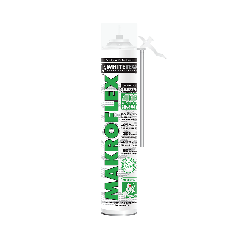 Пена монтажная Makroflex "WhiteTeq" является белой полимерной пеной нового поколения, произведенной по инновационной технологии WHITETEQ, рецептура которой базируется на выделенных ингредиентах высокой очистки. Высокая чистота полимера обеспечивает правильное отверждение пены и придает ей кристальный белоснежный цвет, мелкопористую структуру и высочайшую устойчивость к воздействию дневного, в 10 раз большую в сравнении с типичной технологией производства ПУ-пен. Затвердевшая пена обладает высочайшими характеристиками термо- и звукоизоляции. WHITETEQ также придает пене несравненно низкое давление при расширении для удобства монтажа и возможность компенсации движений и вибраций, что обеспечивает долговременную изоляцию и герметизацию в том числе благодаря свойству термопластичности. Идеальное соотношение открытых и закрытых ячеек, эластичность делают продукт флагманом в области изоляции и монтажа. MAKROFLEX WHITETEQ оснащена стандартной трубочкой-аппликатором, что делает пену легкой в использовании без дополнительных инструментов. Пена обладает отличной адгезией к большинству известных строительных материалов.