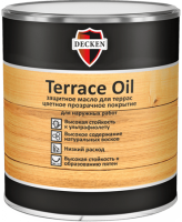 Защитное масло для террас DECKEN Terrace Oil предназначено для обработки террас и других поверхностей с высокой интенсивностью эксплуатации, подверженных интенсивному воздействию УФ-лучей. Бесцветное масло может иметь зеленоватый или коричневатый оттенок (цвет обуславливается наличием натуральных растительных масел и восков и не влияет на цвет обработанной поверхности). 0.75 л на 12 м² в два слоя. Реальный расход зависит от свойств, структуры и подготовки поверхности, способа окрашивания, квалификации исполнителя работ и других факторов. При окрашивании рифленой или грубо обработанной древесины расход масла может существенно увеличиваться. Не образует пленку, не трескается, не шелушится, не отслаивается. Оставляет поры древесины открытыми для выхода влаги. Легко наносится, не засыхает в процессе окрашивания. Защищает от влияние УФ-лучей. Придает поверхности водо- и грязеотталкивающие свойства. Не содержит биоцидов.