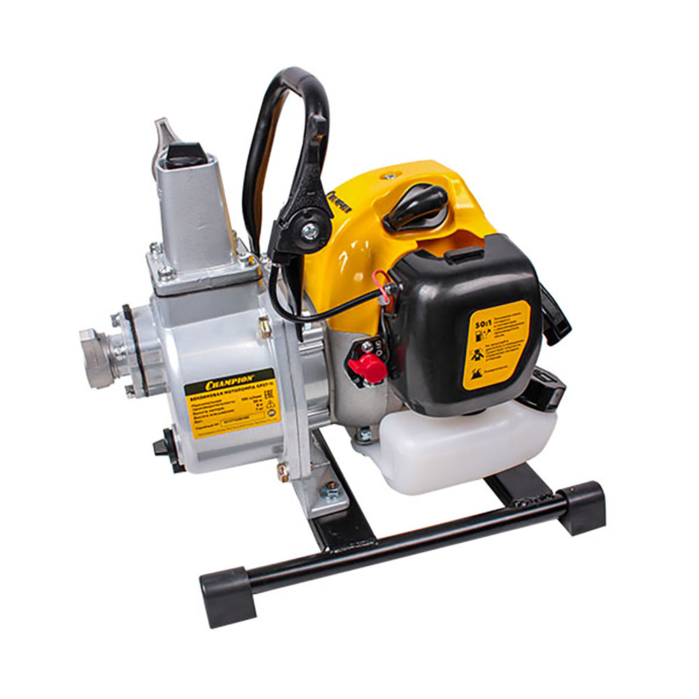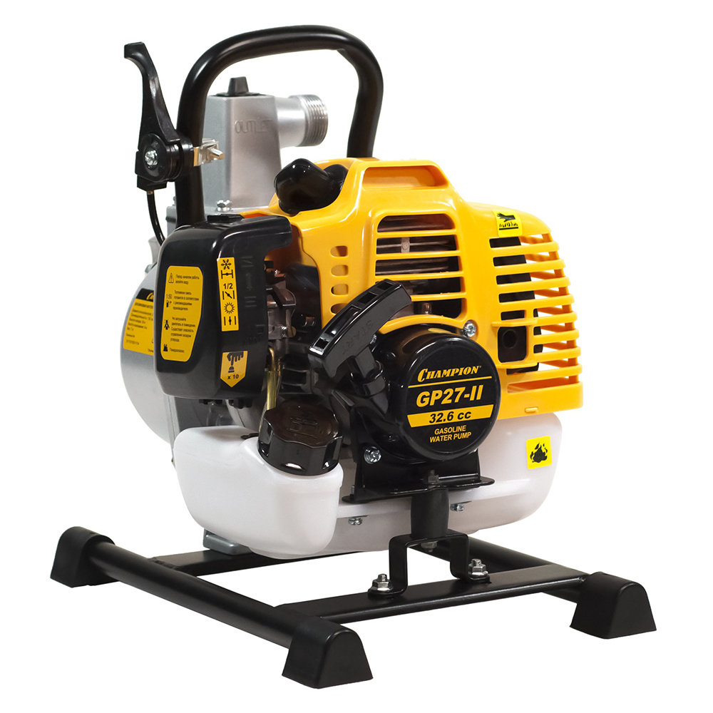 Мотопомпа Champion (Чампион) GP27-II предназначена для перекачки чистых жидкостей. Оснащена двухтактным двигателем мощностью 1,2 л.с. (900 Вт) с воздушным охлаждением. Двигатель работает на топливной смеси: масло для 2-тактных двигателей + бензин АИ92 (в соотношении 1:50). Преимущества: - ручной топливный насос обеспечивает легкий и быстрый запуск двигателя; - бак из полупрозрачного пластика для контроля уровня топлива; - стальная рама с ножками для устойчивости мотопомпы на любой поверхности; - встроенная ручка облегчает переноску изделия; - емкость для приготовления топливной смеси в комплекте. Габариты (ШхВхД): 280х370х390 мм. Запрещается перекачивать грязную воду и химически агрессивные жидкости (бензин, керосин, дизельное топливо, растворители). Гарантия: 1 год.