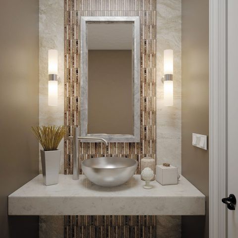 Итальянская компания Skalini представляет уникальное творение природы и рук человека – каменную мозаику безупречного качества и потрясающей красоты. При производстве продукции традиционные способы обработки камня успешно сочетаются с последними технологическими достижениями. Результатом является эксклюзивный отделочный материал, изготовленный из натурального мрамора. Мозаика из мрамора уникальна и неповторима. Ведь натуральный камень представляет собой материал, обладающий исключительной уникальностью цвета, рисунка и текстуры поверхности. Мраморная мозаика завораживает своей яркой фактурой и насыщенными переливами, подчеркивающими благородство и роскошь интерьера. При этом мрамор гармонично вписывается в любое пространство и помещение абсолютно различного назначения. А его природная красота, проявляющаяся характерным рисунком и различными цветовыми оттенками, поможет грамотно расставить акценты в помещении или зонировать пространство. Мозаика из мрамора Skalini Golden Line GLN-5 станет отличным решением для яркого эксклюзивного интерьера. По сравнению со стандартной мозаикой она имеет довольно оригинальный внешний вид. Полотно составлено чипами продолговатой прямоугольной формы, которые украшены орнаментом. Сочетание элементов различных оттенков с натуральной фактурой мрамора и металлизированной поверхностью образует яркий и стильный отделочный материал. Покрытие неприхотливо в уходе, а укладка осуществляется легко и быстро благодаря тому, что отдельные элементы собраны на сетке размером 300х300 мм. Мраморная мозаика довольно практична, ведь мрамор является прочным и долговечным материалом. Недаром мрамор применяли при отделке царских дворцов. Такая мозаика при правильном монтаже и грамотном использовании прослужит владельцам не один десяток лет и абсолютно не потеряет свой привлекательный внешний вид. Кроме того, это экологически чистый и безопасный отделочный материал, который не имеет запаха, не выделяет вредных веществ и поддерживает в помещении природный микроклимат. Мозаика Golden Line привнесет в интерьер ощущение роскоши и яркой индивидуальности. Мозаика Skalini Golden Line GLN-5 предназначена для использования в качестве настенного покрытия внутри помещений, в том числе в душевых. Не рекомендуется укладка снаружи помещений, на полу, в паровых комнатах и бассейнах. Преимущества мозаики Skalini Golden Line: Эксклюзивный и роскошный внешний вид отделочного материала. Высокая прочность и долговечность покрытия. Натуральный экологически чистый материал. Простота в уходе, покрытие чистится обычными моющими средствами. Отдельные элементы мозаики собраны в удобного размера фрагменты, что существенно ускоряет процесс укладки.