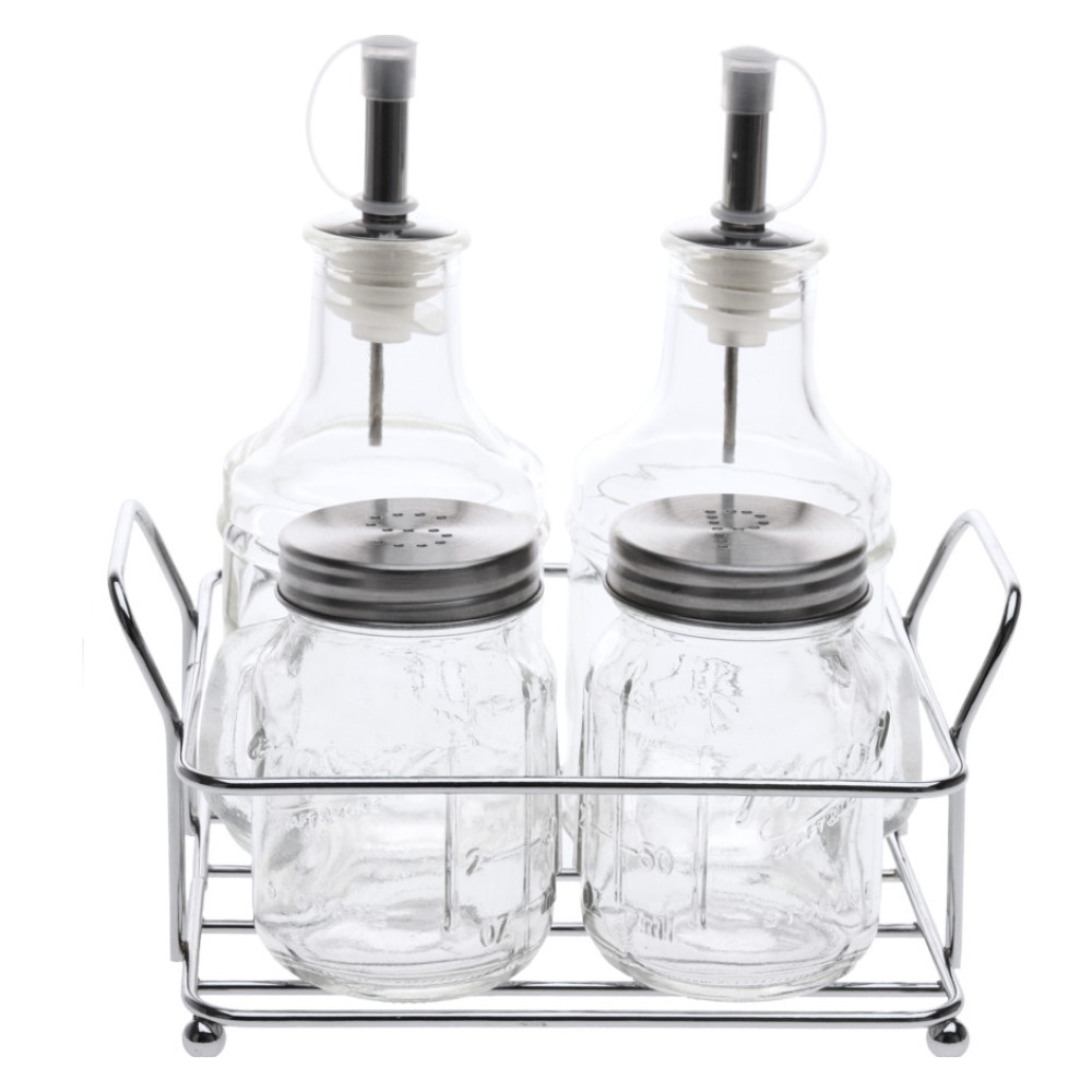 Набор состоит из двух емкостей с дозаторами для хранения масла и уксуса, двух баночек для хранения соли и перца, подставки. Специальные пробки-дозаторы с заглушками изготовлены из нержавеющей стали и предотвращают от пролива лишней порции. На диспенсеры для специй нанесена мерная шкала. Закручивающиеся крышки с перфорацией P и S позволяют легко наполнить контейнеры. Подставка изготовлена из хромированной стали, для удобства оснащена ручками. Размер подставки: 17x13x8 см. Размер емкости для специй: 5x8 см. Размер емкости для масла/уксуса: 6,5x16,8 см.