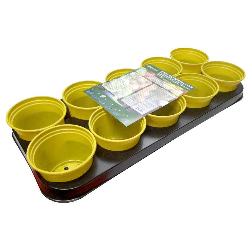 Комплект для рассады состоит из 10 пластиковых горшков объемом 0,6 л и подставки.
