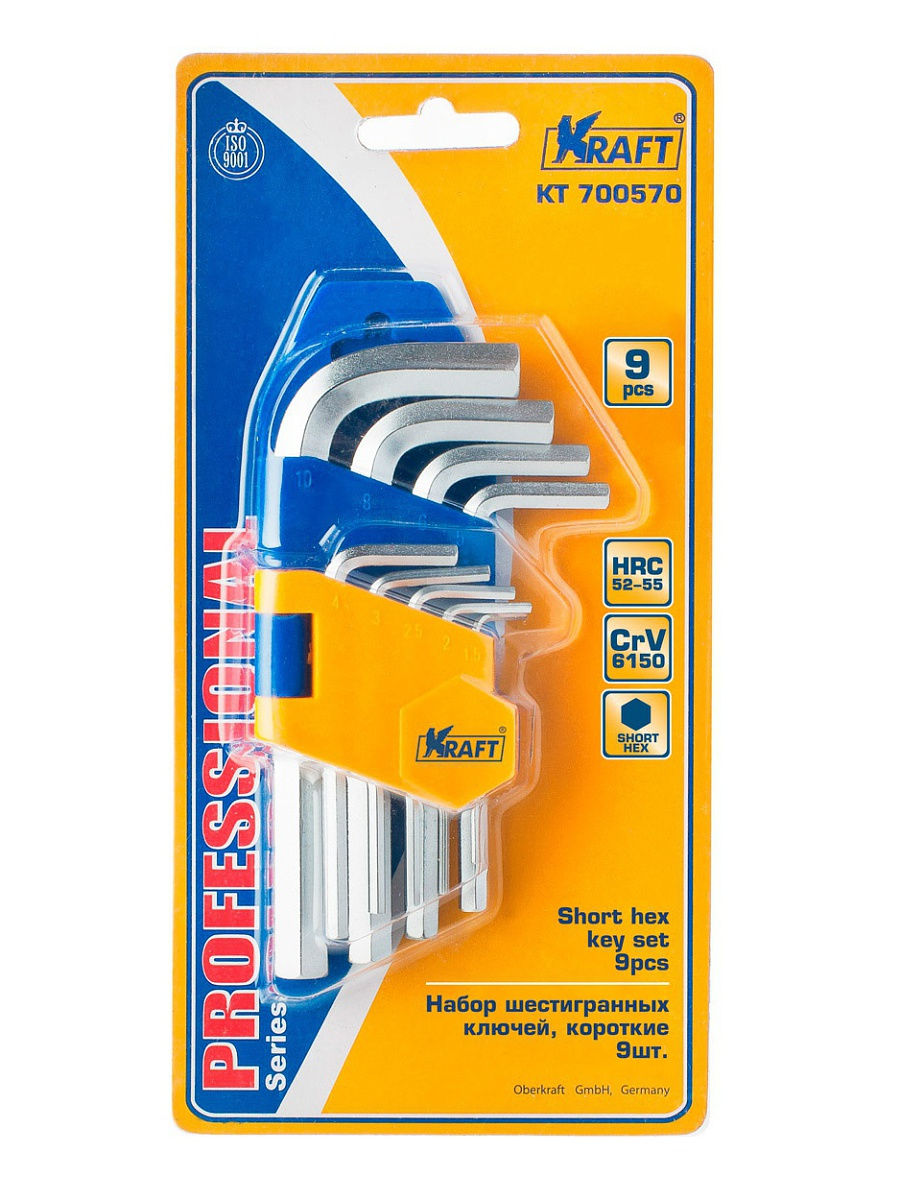 Набор шестигранных укороченных ключей Kraft \"Professional\" нужен при обслуживании автомобилей, велосипедов, техники и оборудования. Г-образные ключи с рабочей частью, сечение которой представляет правильный шестиугольник, предназначены для откручивания и закручивания крепежа с шестигранным шлицом. Каждый ключ изготовлен из хромованадиевой стали. Размеры: 1,5; 2; 2,5; 3; 4; 5; 6; 8; 10.