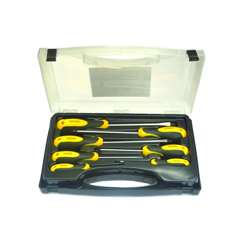 Набор из 7 отверток: плоский шлиц - 3х65, 5х100, 6х150, 8х150, крестовой шлиц - #0х75, #1х100, #2х150. Изготовлены из хром-ванадиевой стали. Двухкомпонентная эргономичная ручка. Намагниченный наконечник.