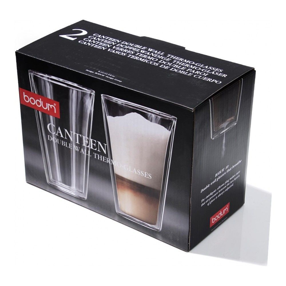 Набор Canteen – это два красивых стеклянных термобокала объёмом 400 мл каждый. Тепло напитка в них сохраняется долго благодаря двуслойным стенкам и прослойке воздуха между ними. В этих бокалах не только горячие напитки сохраняют свою температуру, но и холодные, например кофе фраппе, в жаркий день, не нагреются. В соответствии с технологией марки BODUM каждый такой бокал сделан вручную из тонкого и прочного боросиликатного стекла. Набор термобокалов BODUM Canteen, 0.35 л, видео