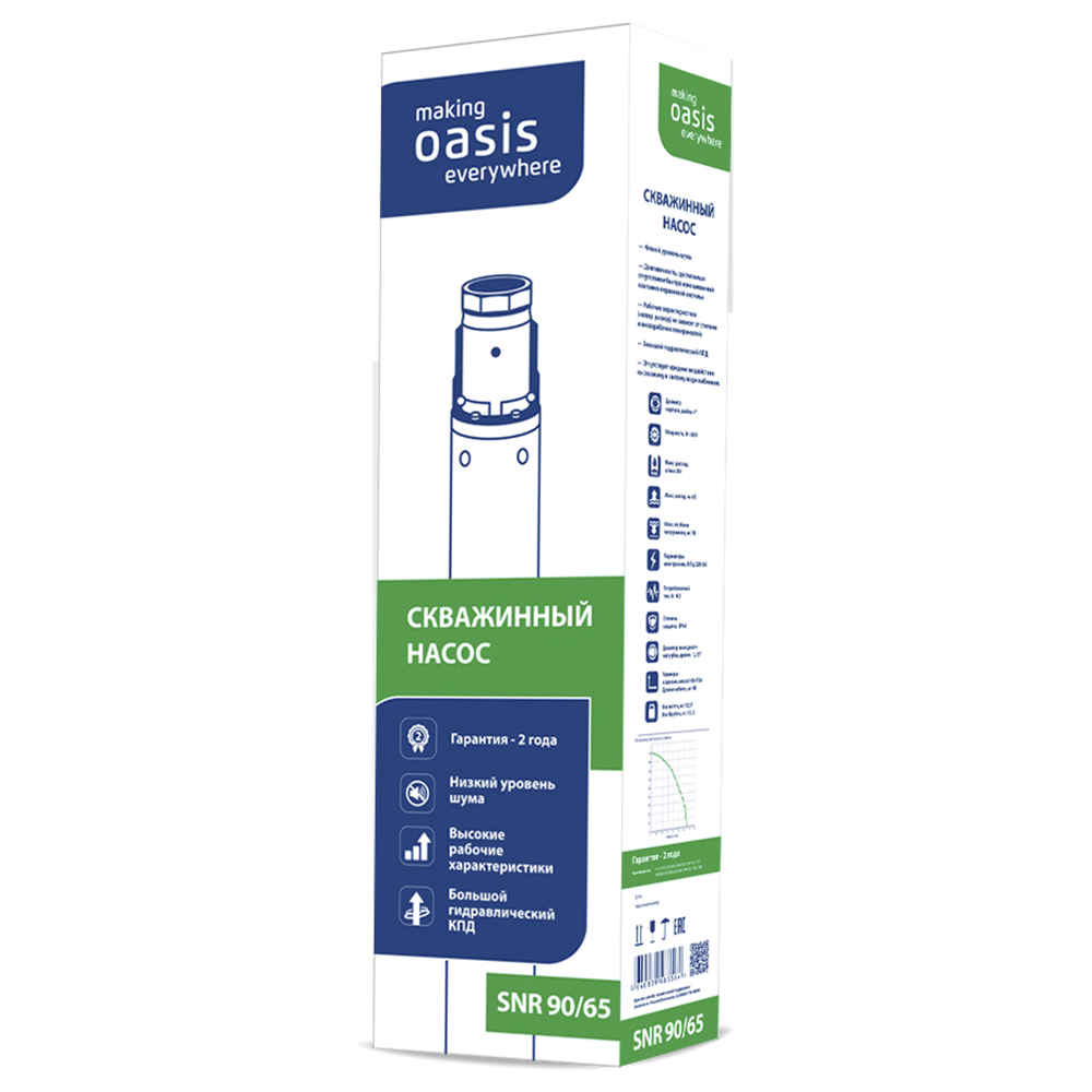 Погружной насос Оasis (Оазис) SNR 90/65 для подачи воды из скважин, колодцев, внутренний диаметр которых составляет от 100 мм. Изделие имеет прочный корпус из нержавеющей стали - долгий срок службы, повышенная устойчивость к воздействию механических загрязнений в перекачиваемой воде. Рекомендован для организации полива сада, огорода, водоснабжения частного дома, подавая воду из колодцев, открытых водоемов и различных резервуаров. Долговечность изделия достигается отсутствием быстро изнашиваемой клапанно-поршневой системы. Дополнительный комфорт обеспечивается благодаря низкому уровню шума. С износом рабочих поверхностей характеристики (напор, расход) не изменяются. Установка насоса: вертикальная. Максимальный расход - 90 л/мин. Максимальный напор - 65 м.