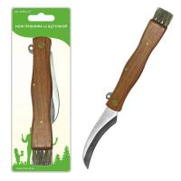 Складной нож предназначен для походов за грибами. Тонким изогнутым лезвием удобно срезать и очищать грибы. На ручке есть кисточка для очистки грибов от земли. Также имеется петля, позволяющая закреплять нож на ремне или корзине с помощью шнура или карабина. Изготовлено: лезвие из нержавеющей стали, накладные детали рукоятки из дерева, щеточка из натуральной щетины.