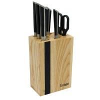 Толщина лезвия 2-3 мм, нержавеющая сталь. Поварской нож, филейный нож, нож для мяса, универсальный нож, нож для фруктов и кухонные ножницы. Ножи можно мыть в посудомоечной машине. Удобная ручка из ABS-пластика с металлическими вставками. Подставка из дерева с акриловой вставкой. Толщина клинков от 2 до 3 мм.