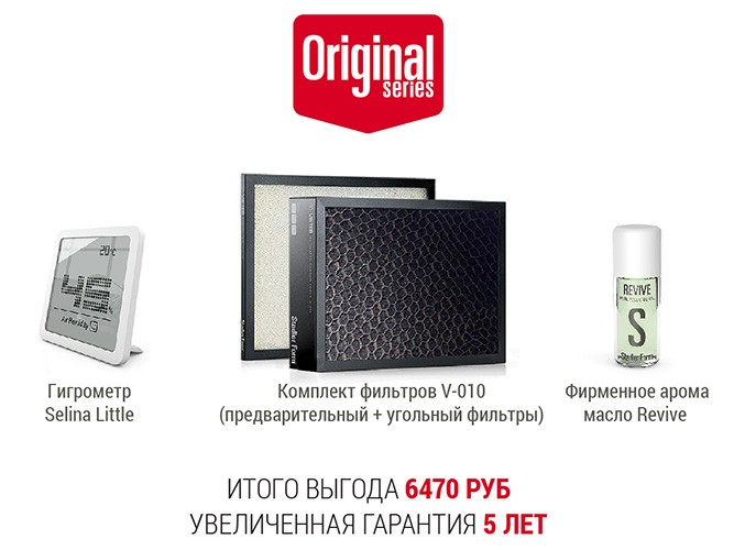 Очиститель Viktor original оснащен тремя системами очистки, избавляющими воздух от пыли, шерсти, пыльцы, смога, неприятных запахов и микроорганизмов. Основной HPP-фильтр менять не нужно! Эффективность очистки подтверждена Европейским центром исследования аллергии ECARF. Прибор из лимитированной серии Original: в расширенную комплектацию входит дополнительный комплект фильтров, гигрометр Selina Little, и фирменное эфирное масло Revive, а гарантия от производителя увеличена до пяти лет!