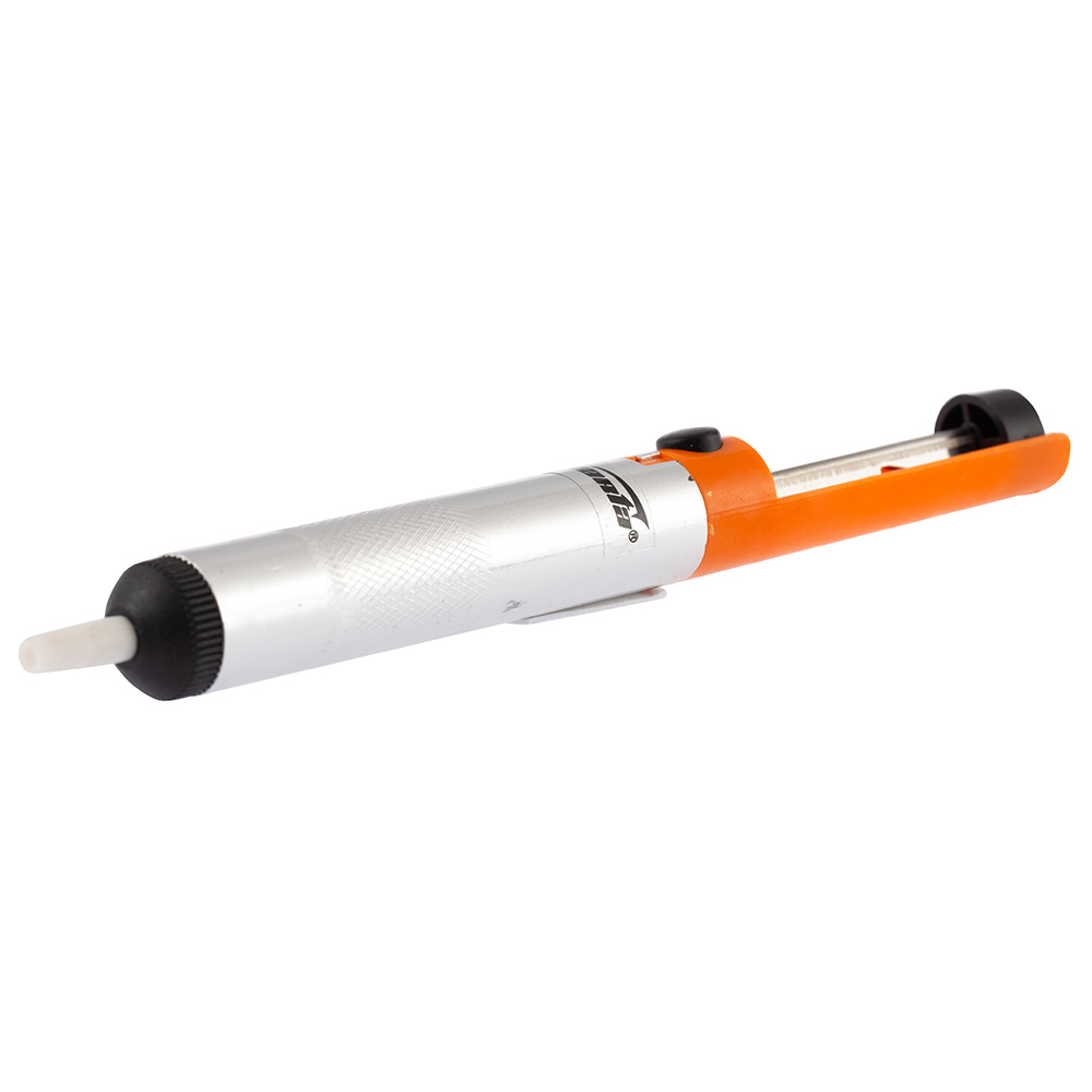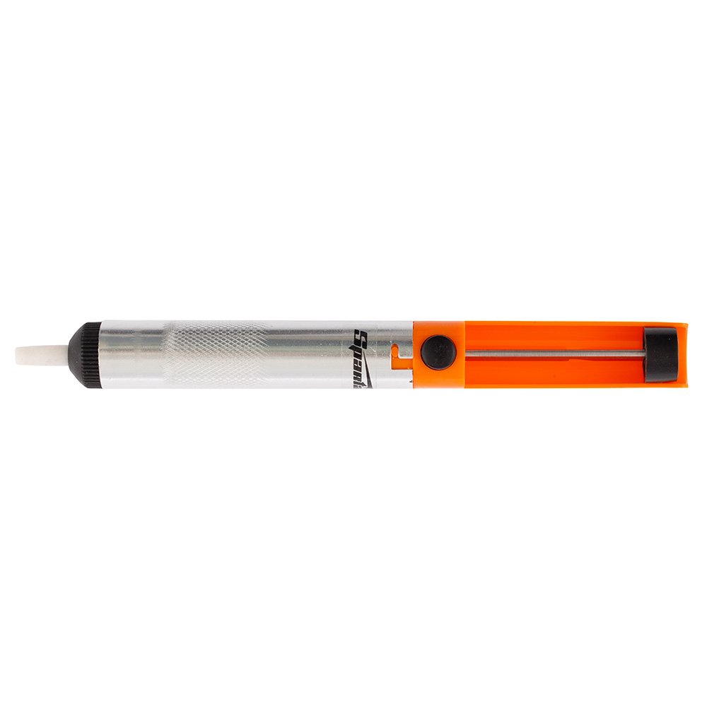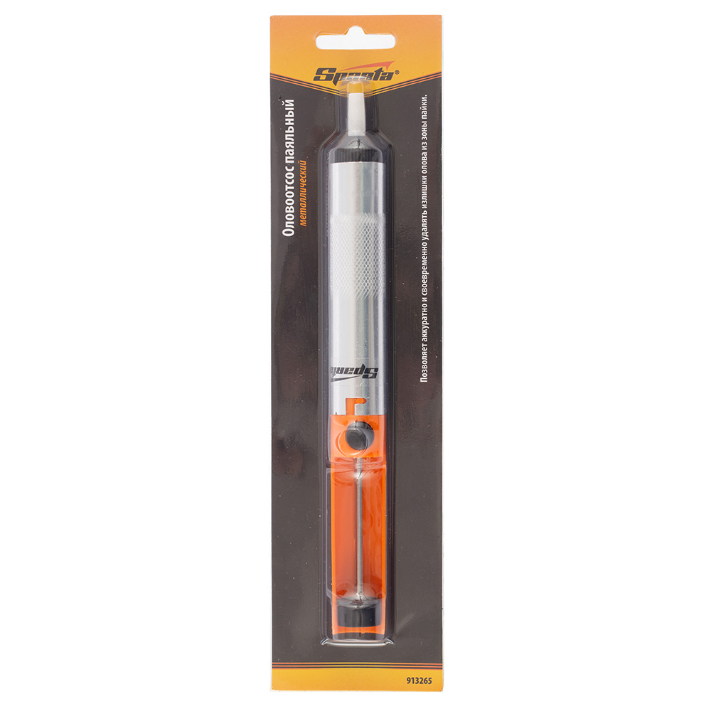 Паяльный металлический оловоотсос Sparta (Спарта) 913265 выполнен из металла, имеет удобную конструкцию и яркую оранжевую рукоять, благодаря чему хорошо заметен в ящике для инструментов. Предназначен для удаления остатков припоя. Применение: Перед применением такого прибора по назначению припой нужно хорошо разогреть, это облегчит его всасывание. Принцип работы такой же, как у медицинского шприца: сначала нужно надавить на поршень до упора, а затем возвращать назад, затягивая припой.