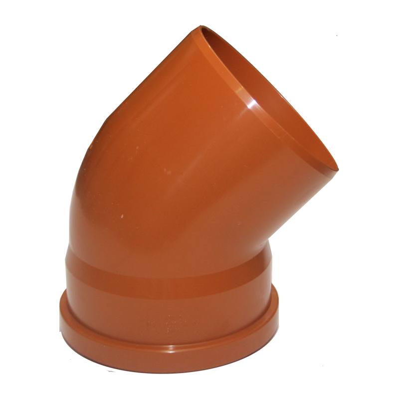 Отвод наружный d=160мм 45°. СИНИКОН. Изготовлен из непластифицированного ПВХ (НПВХ). Предназначен для прокладки наружных самотечных канализационных систем.Материал обладает высокой жесткостью. Класс жесткости SN4. Стойкость к кислотам и щелочам. Высокая твердость и формоустойчивость. Соединение труб рассчитаны на давление 0,5 бар при температуре 20°С. Температура сточных вод до 60°С. Химическая устойчивость труб и фасонных частей и уплотнений сохраняется для сточных вод со значением рН 2-12. Однолепестковые уплотнения из SBR резины. Способ соединения – раструбное. Простота и удобство монтажа без специальных инструментов и приспособлений.