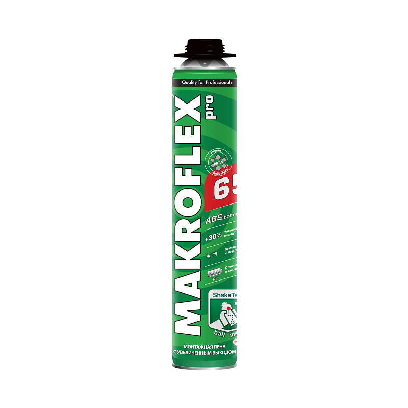 Однокомпонентная полиуретановая монтажная пена, затвердевающая под воздействием влажности воздуха до полуэластичного состояния. Баллон оснащен специальным вентилем для использования с пистолетом-аппликатором. Пена имеет незначительное вторичное расширение. В затвердевшем виде пена Makroflex не токсична и не огнеопасна. Превосходная адгезия к большинству строительных материалов, хорошие тепло- и звукоизоляционные свойства, влагоустойчивая, не разрушается с течением времени, требует защиты от попадания солнечных лучей. Используется при температуре окружающей среды не ниже +5 °C. Применима для следующей деятельности: установка окон и дверей, герметизация отверстий, щелей, стыков, герметизация мест соединения кровельных конструкций и изоляционных материалов, создание звукоизоляционных экранов, герметизация проходов вокруг труб, монтаж строительных деталей.