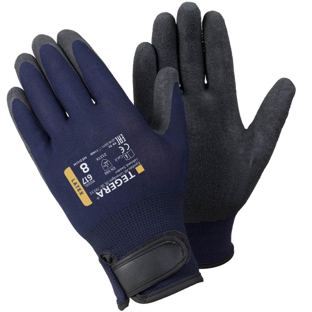 Садовые перчатки TEGERA для выполнения работ различной сложности. Основной материал нейлон, вентилируемая тыльная сторона ладони. Водоотталкивающая рабочая область покрыта латексом гранулированной текстуры. Для надежной фиксации на руке есть застежка-липучка. Защита от: истирания, царапин, волдырей, общепроизводственных загрязнений. Цвет синий/черный.