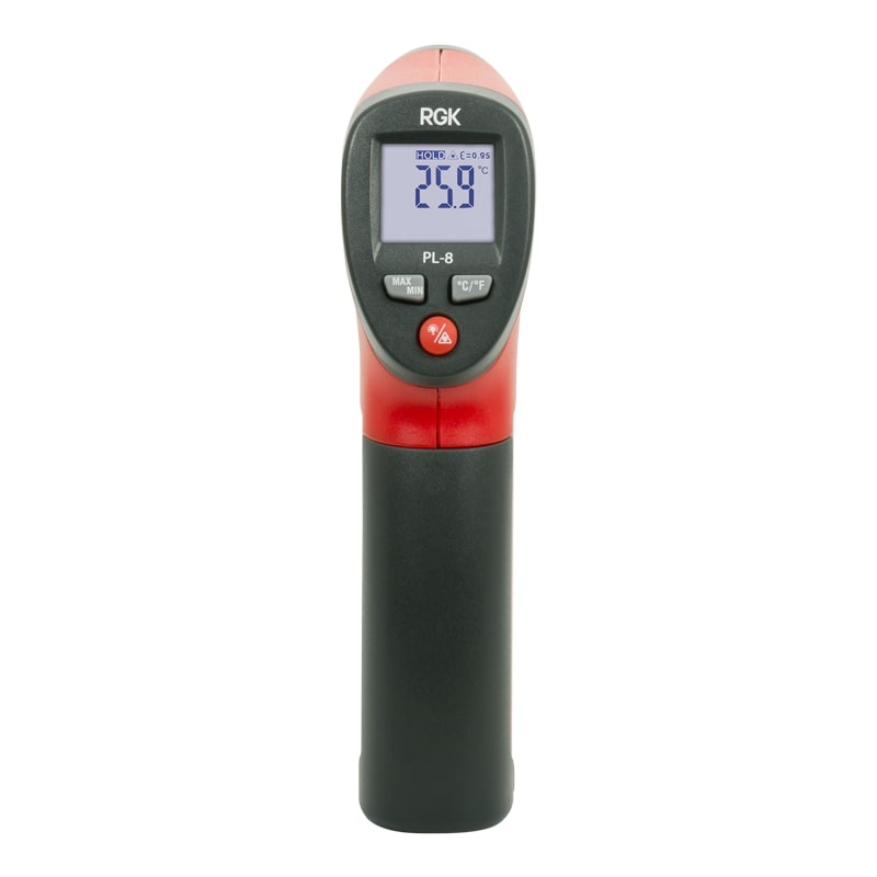 - Лазерный указатель, которым оснащён пирометр RGK PL-8 с поверкой, облегчает наведение на цель – вы всегда точно определите область, в которой производится измерение.