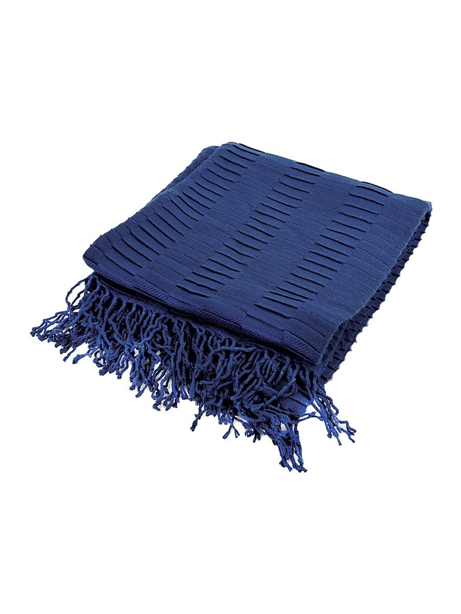 Яркий плед с фактурным узором на ткани. Два края обшиты бахромой. Плед станет стильным цветовым акцентом в вашем интерьере. Изделие практично в использовании благодаря свойствам акрила: высокая прочность, стойкость к износу, влаге и выцветанию. Также важное качество этого материала - гипоаллергенность. Мягкий и теплый из-за плотности ткани 200 г/м2, приятный на ощупь плед согреет вас холодными вечерами. Размер: 130x150 см, бахрома - 10 см. Цвет: синий. Упаковка подарочная: атласная лента и открытка. Состав: акрил 100%